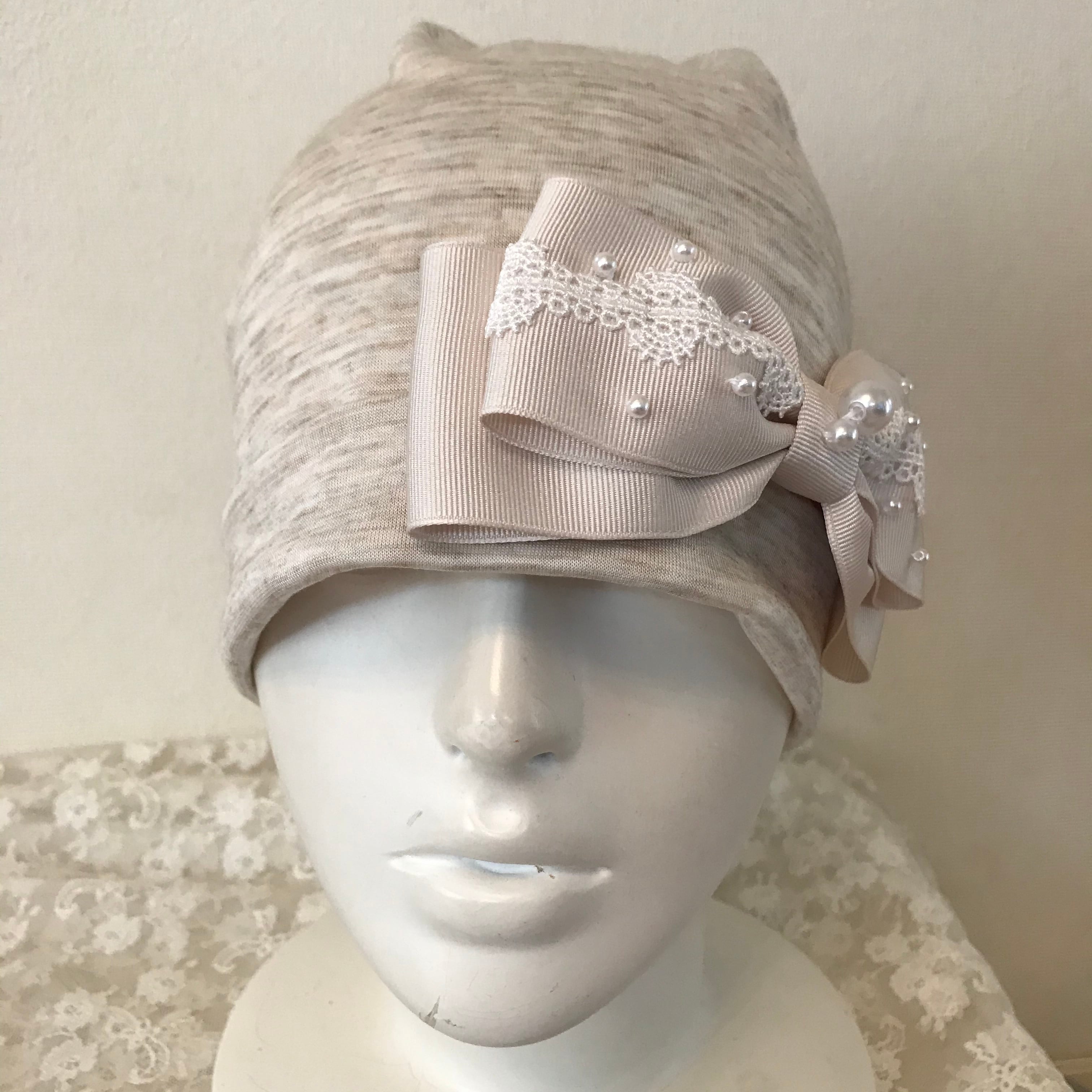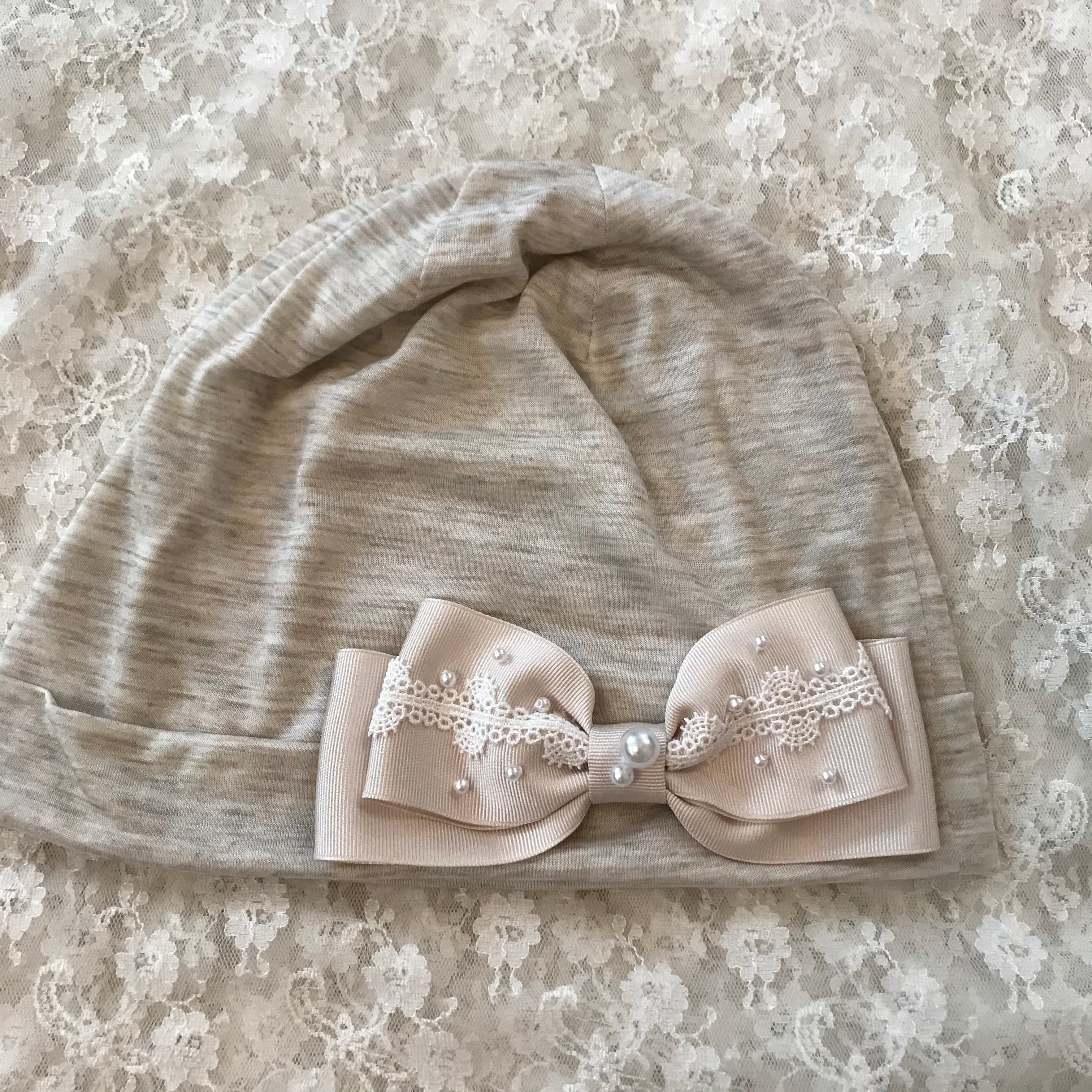肌触りの良いお生地を使用したお帽子にパールとレース付きグログランリボンを付けた可愛いデザインです。