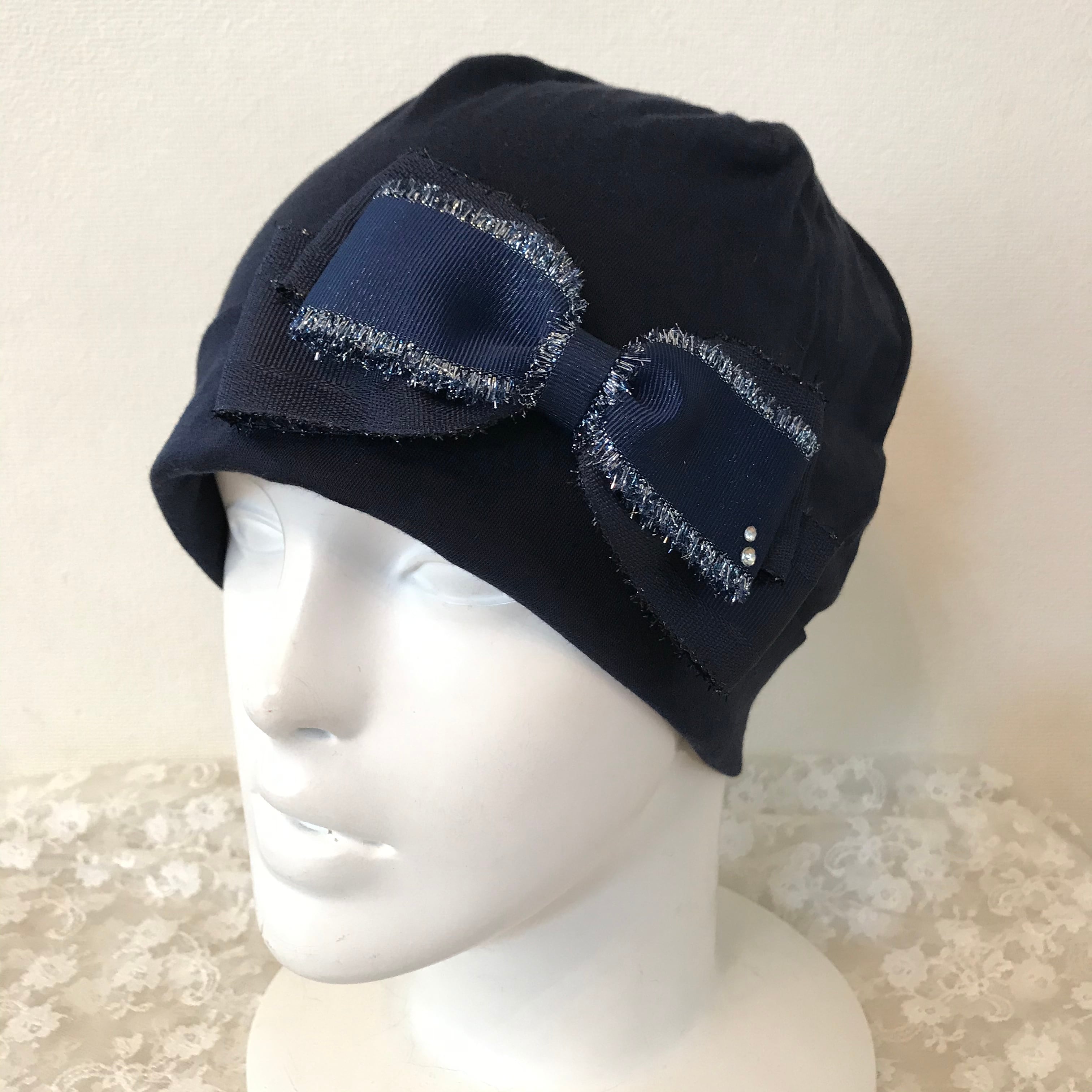 スワロフスキーとシルバーフリンジリボンのケア帽子 ネイビー