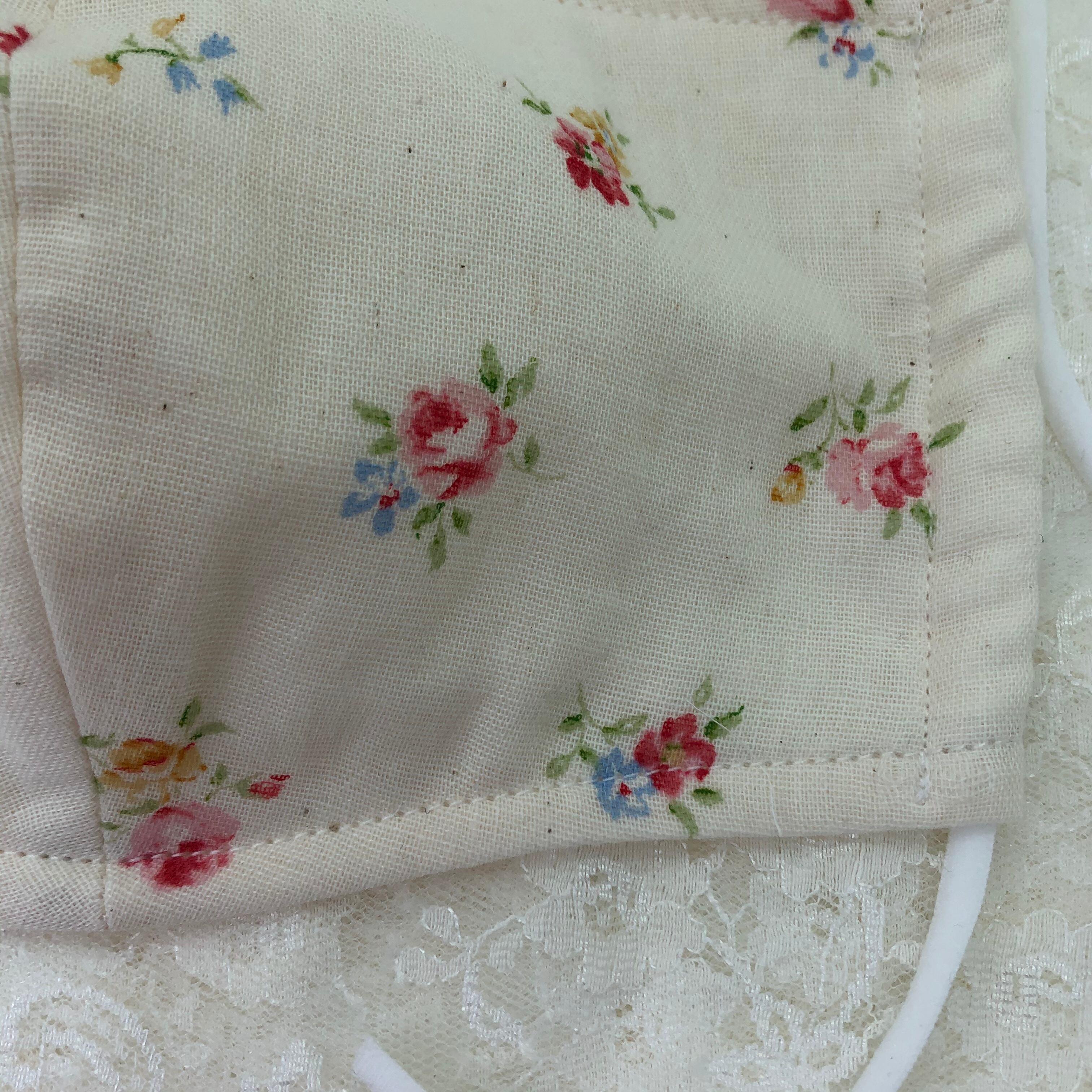 お花柄の二重ガーゼを使い立体的に仕上げたマスクです。ノーズワイヤーは入っておりませんがフィット感がありお喋りしてもお鼻や口が出て来にくいです。