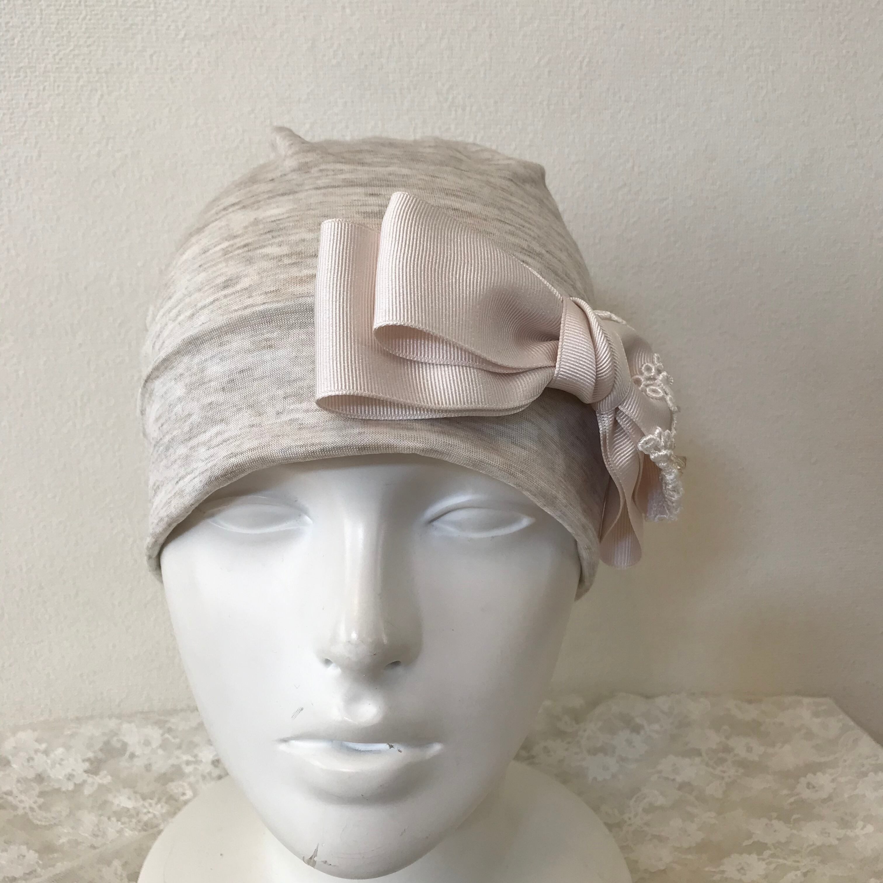 スワロフスキービーズとレースリボンのケア帽子 茶系