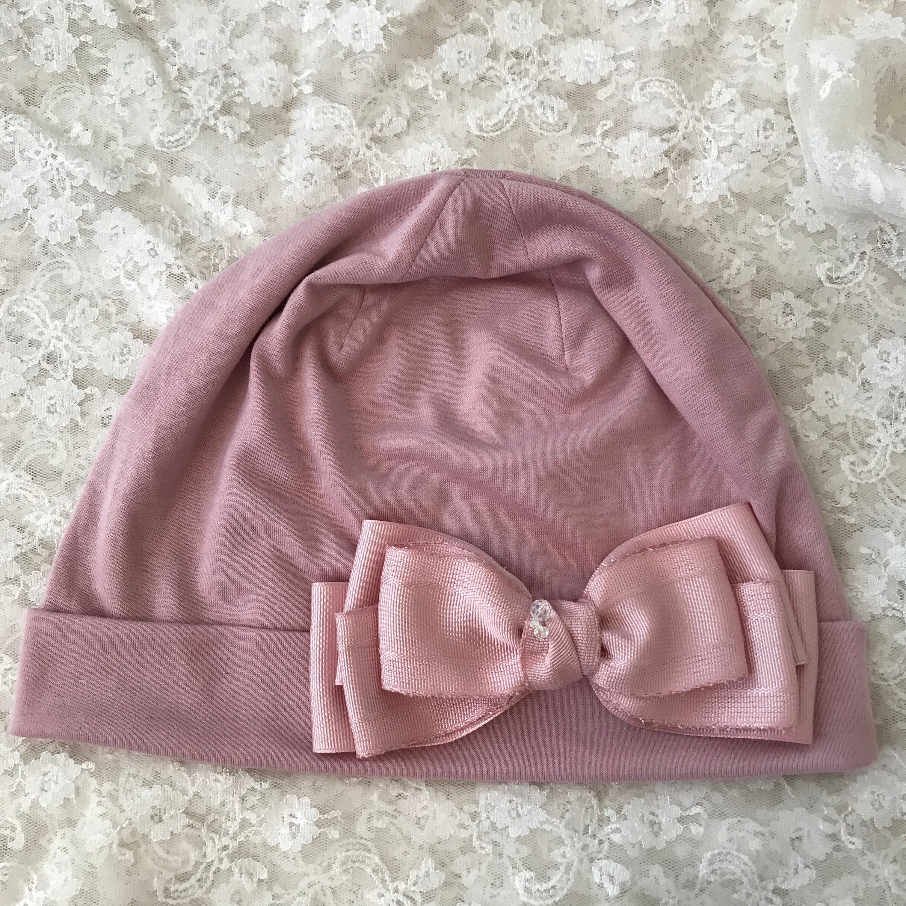 肌触りの良い、伸縮性のあるお生地で作ったお帽子に、スワロフスキービーズ付きグログランリボンを付けた素敵なデザインです。