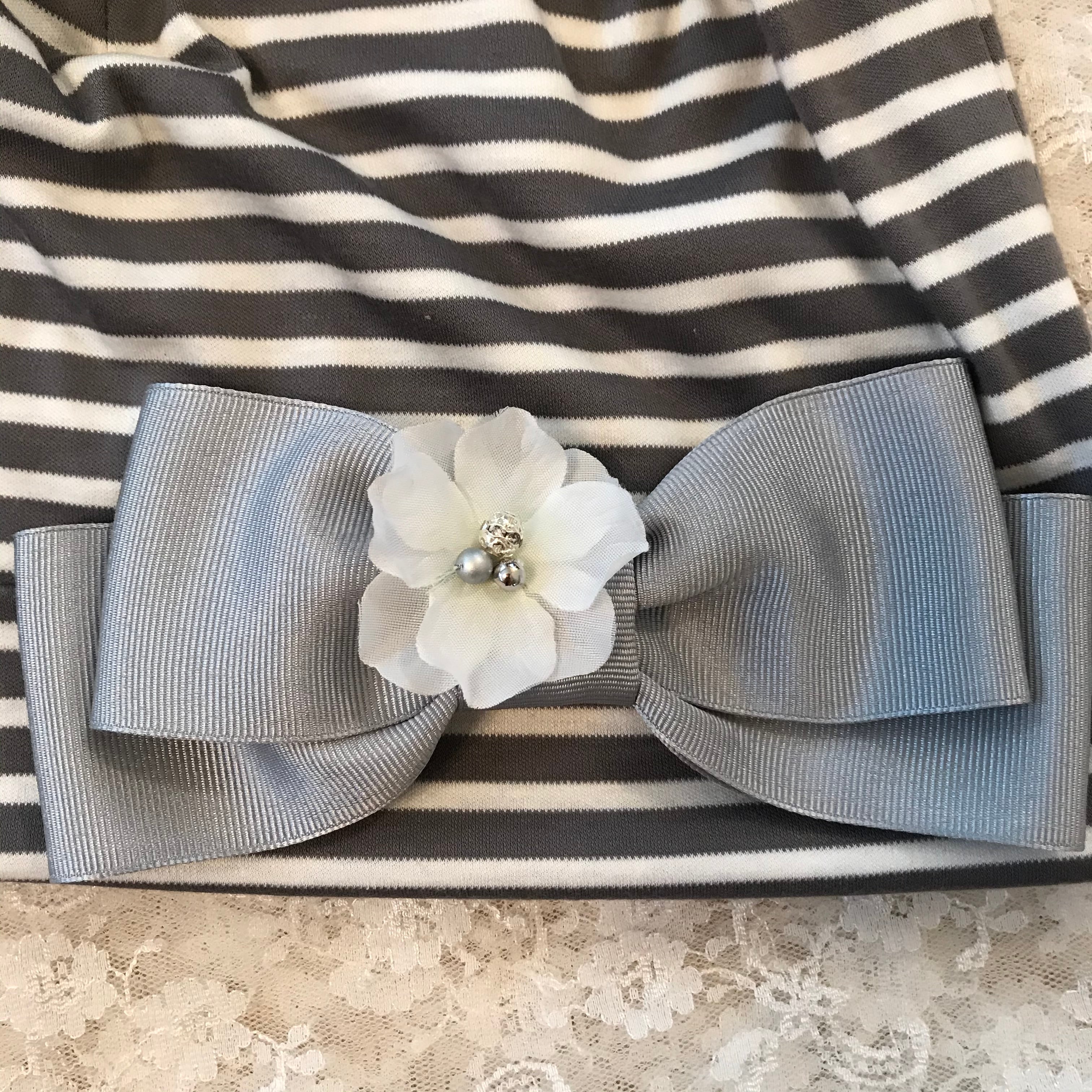 肌触りの良い、伸縮性のあるお生地で作ったお帽子に、お花とキラキラボール付きグログランリボンを付けた素敵なデザインです。