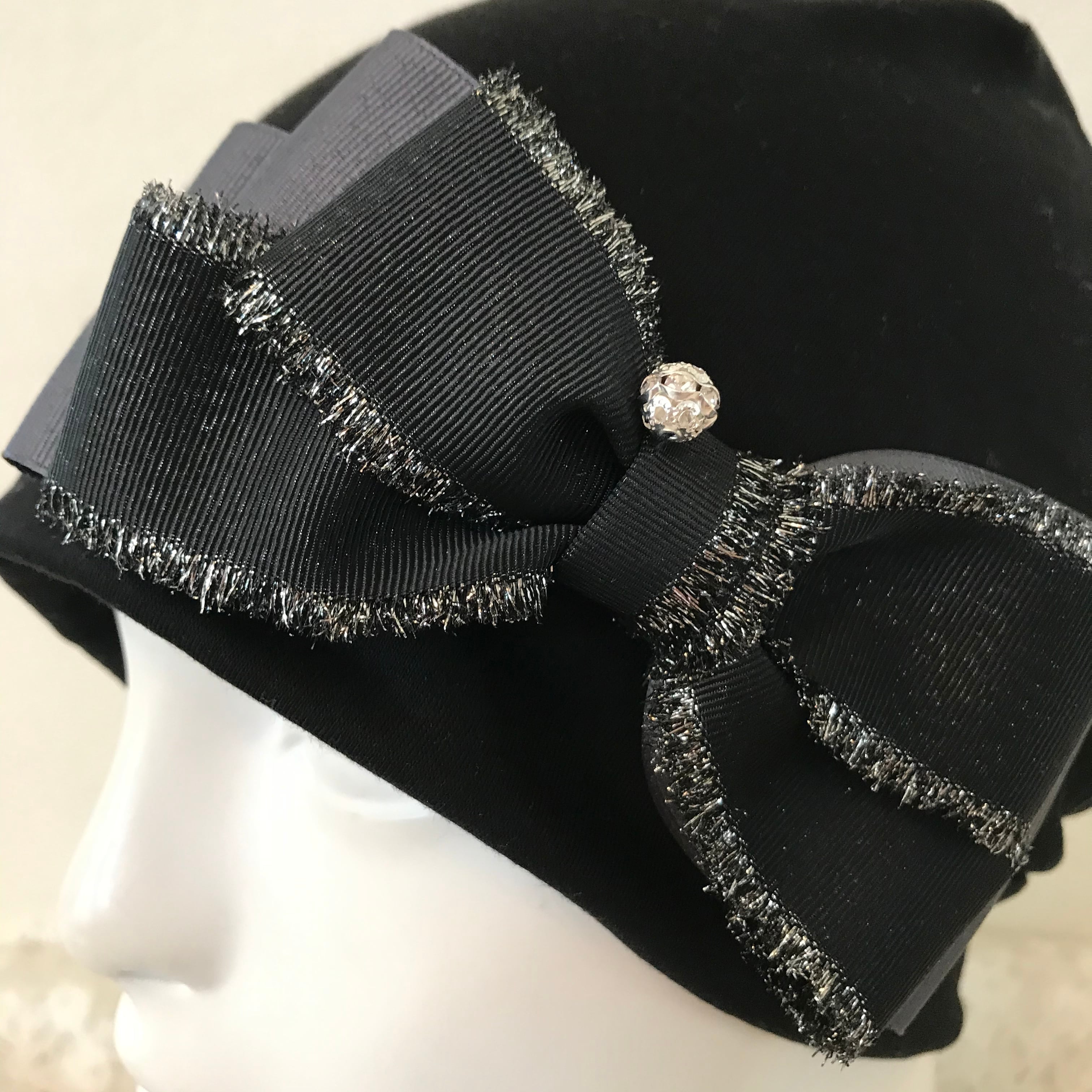 そのお帽子にパールとレース付きグログランリボンを付けた素敵なデザインです。
