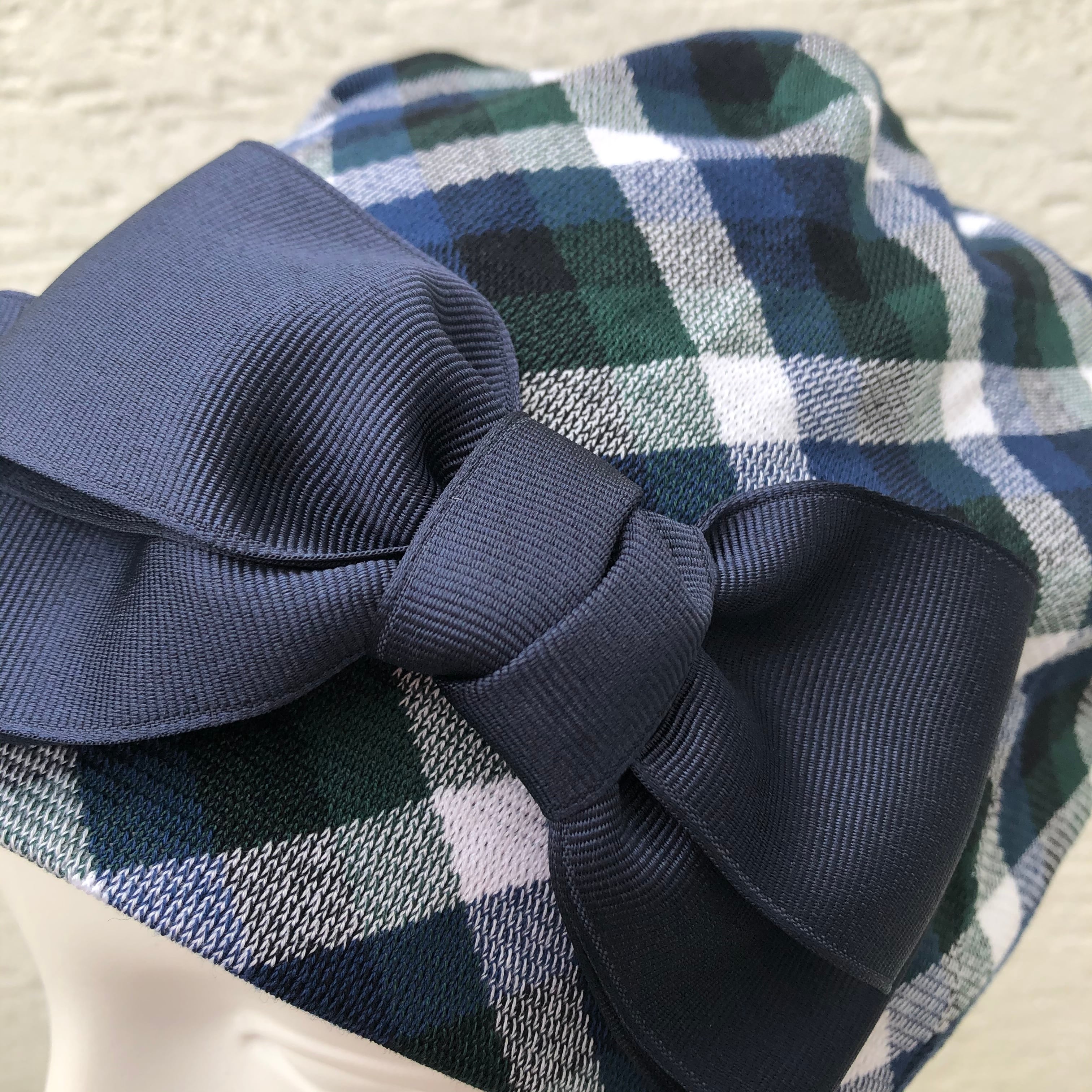 コットン100%チェック柄生地のケア帽子 ネイビー系 内側コットン100%