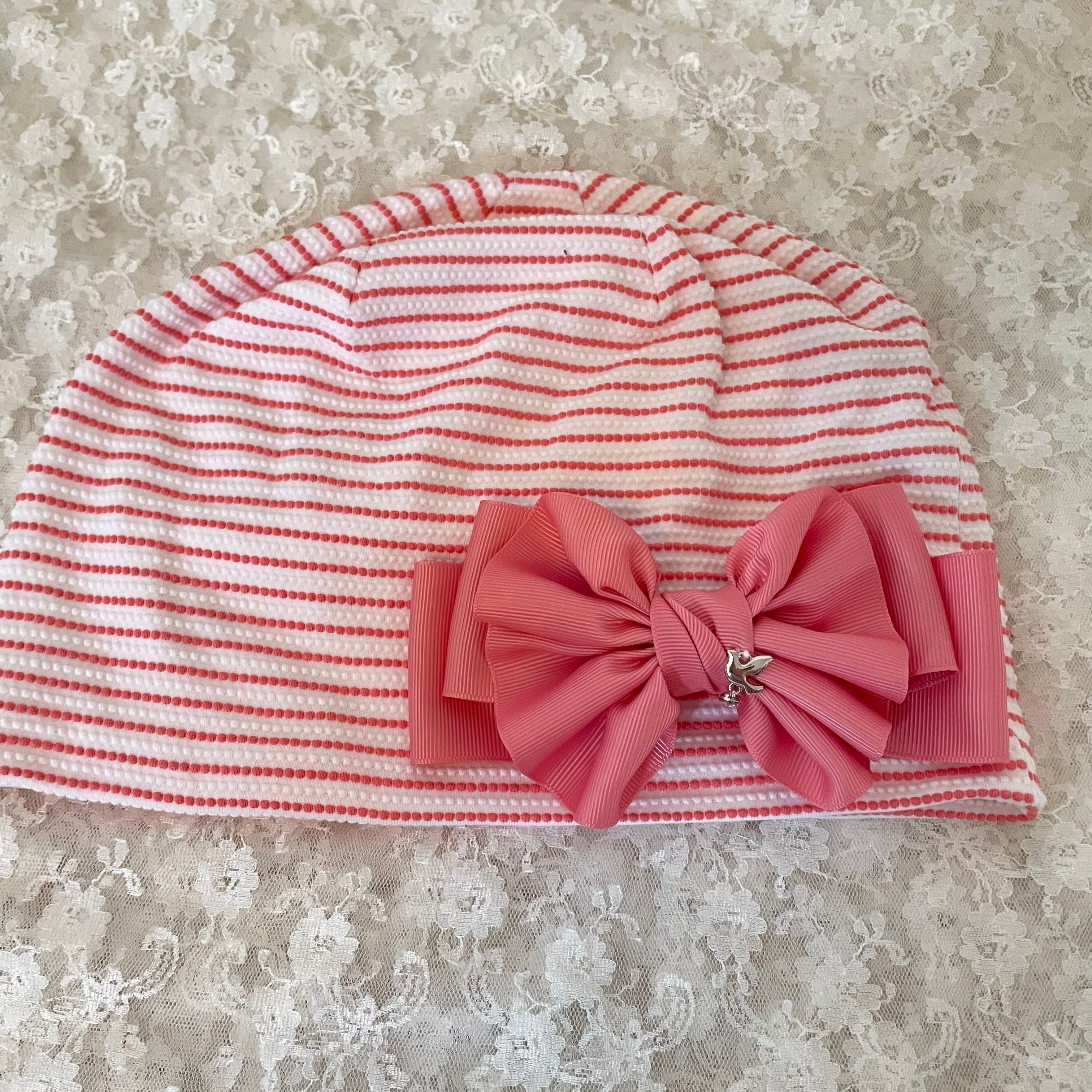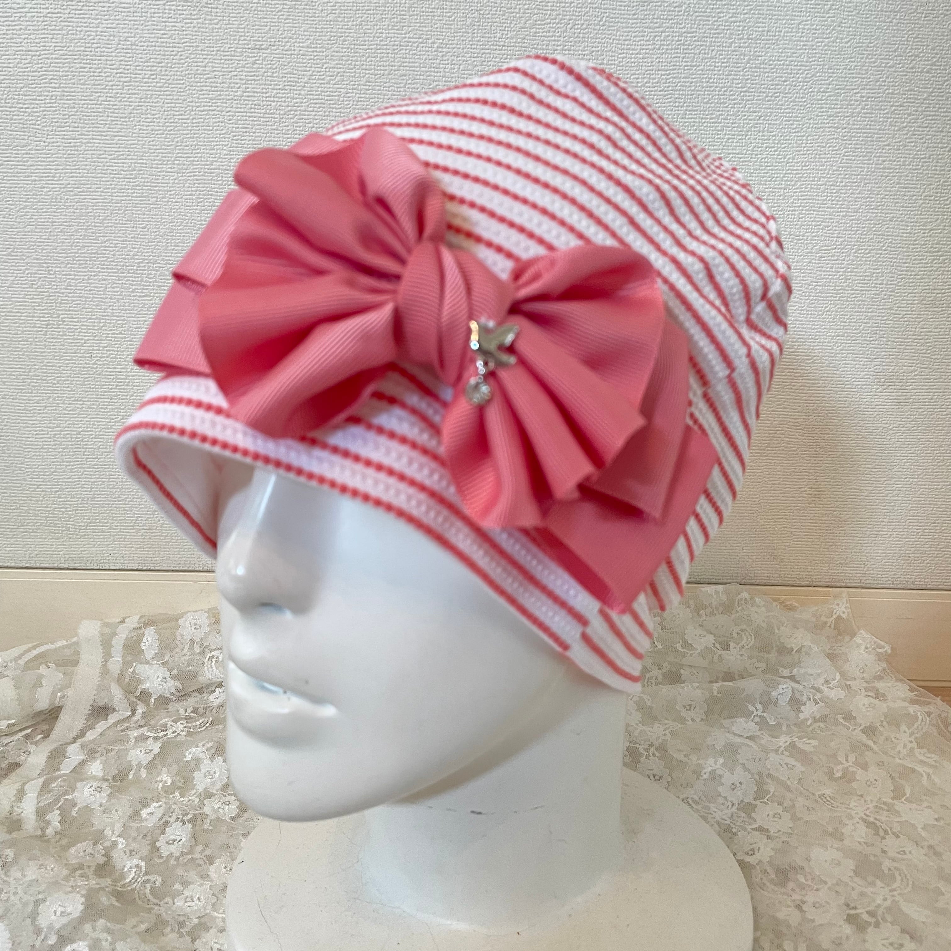 そのお帽子ににチャーム付きグログランリボンを付けた素敵なデザインです。