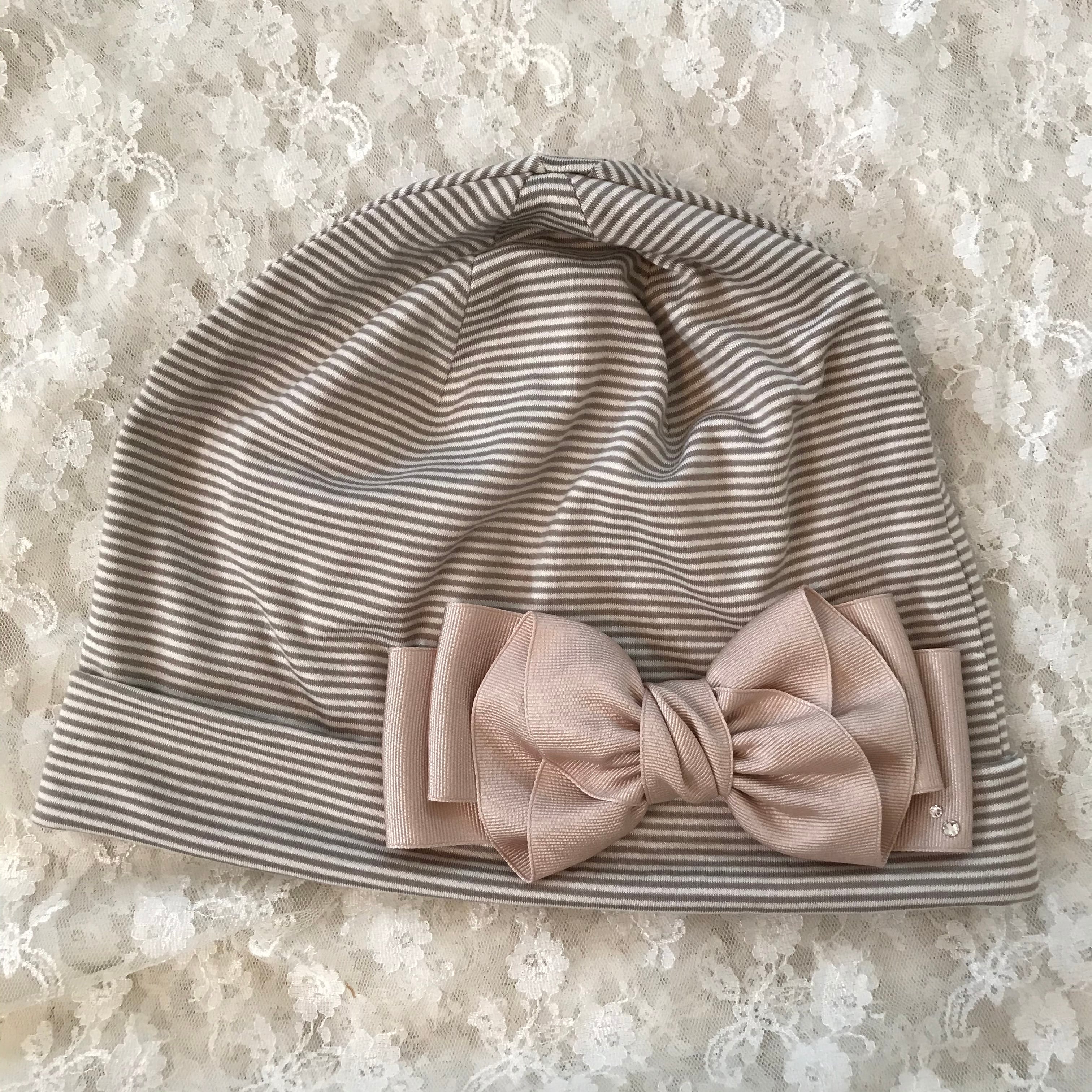 スワロフスキー付きリボンのケア帽子 茶系ボーダー