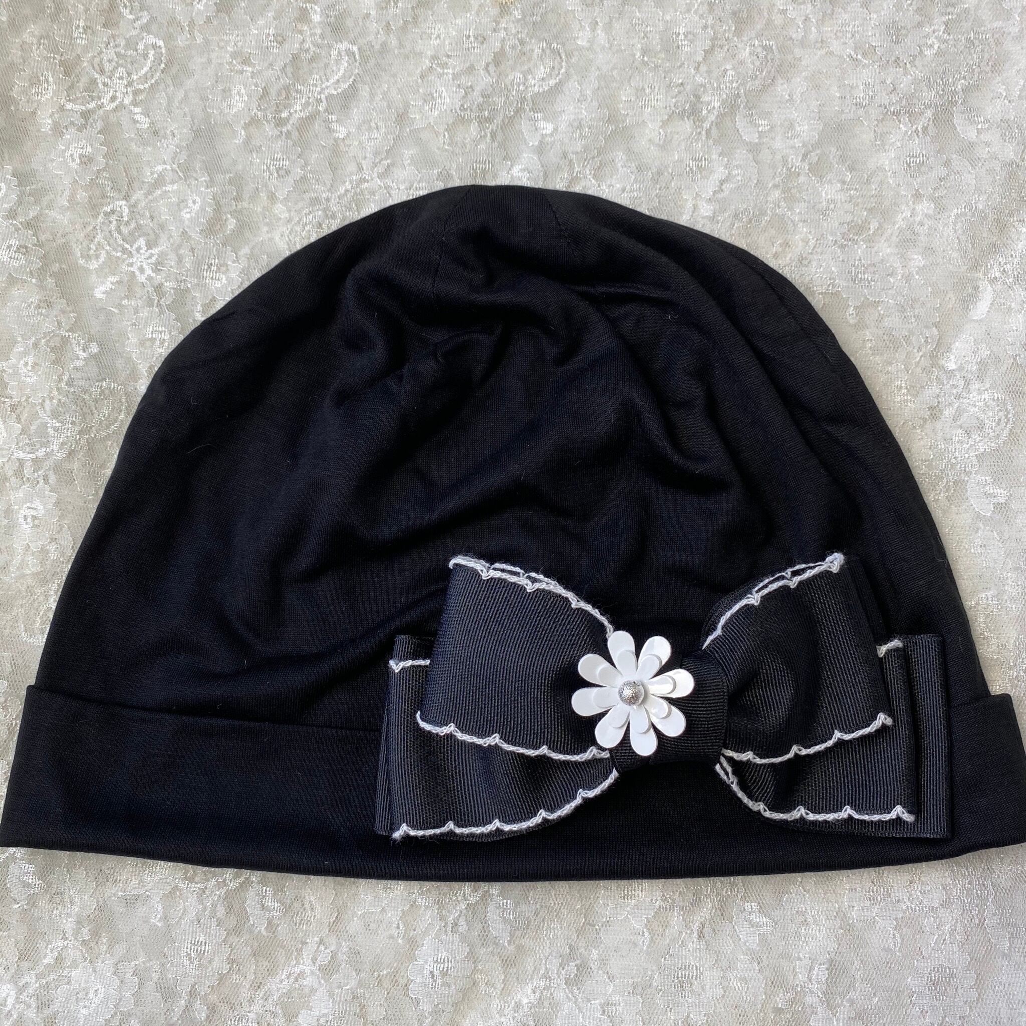 肌触りの良い、伸縮性のあるお生地で作ったお帽子に、お花付きピコットリボンを付けた可愛いデザインです。