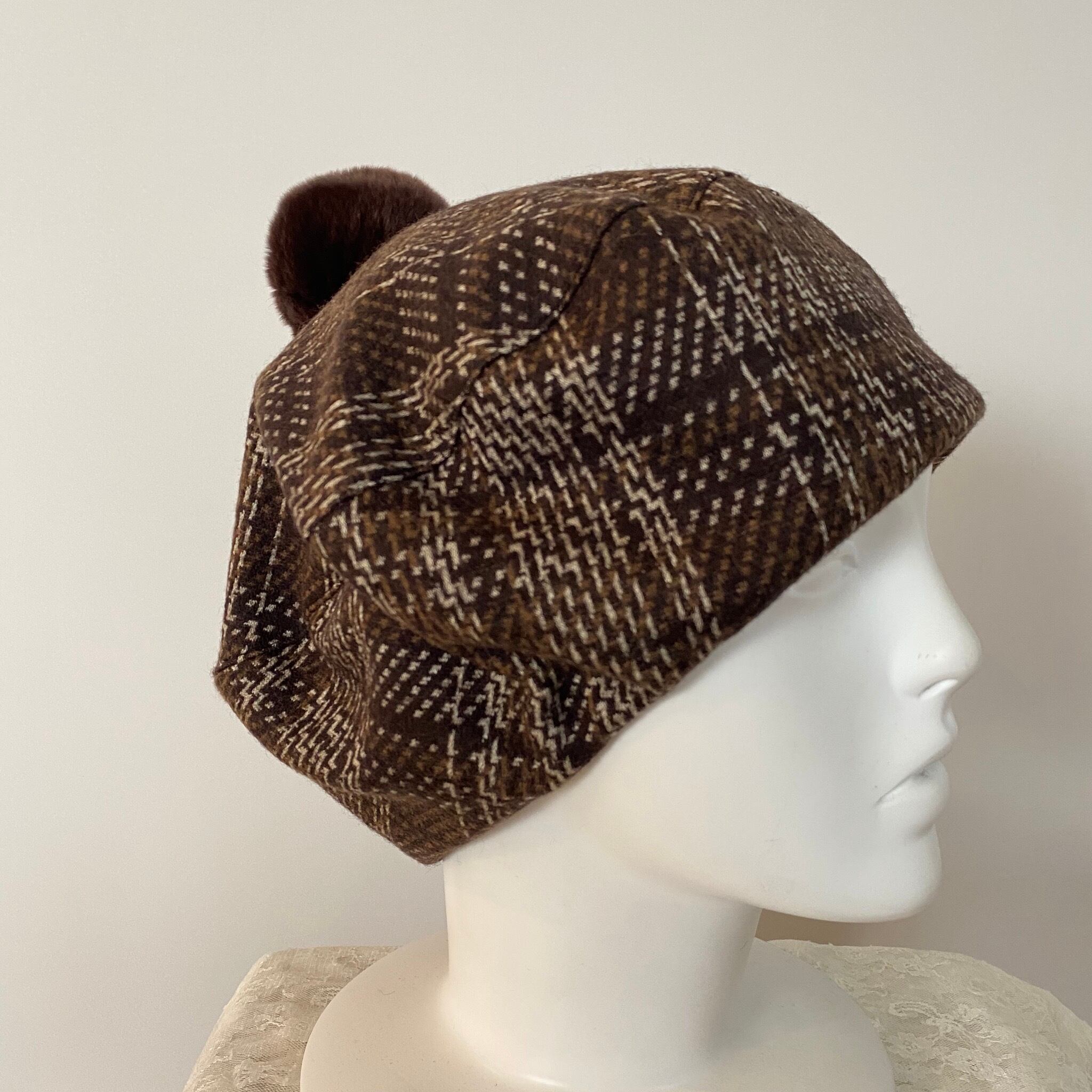 ファーポンポン付きお生地たっぷりベレー帽 茶系チェック