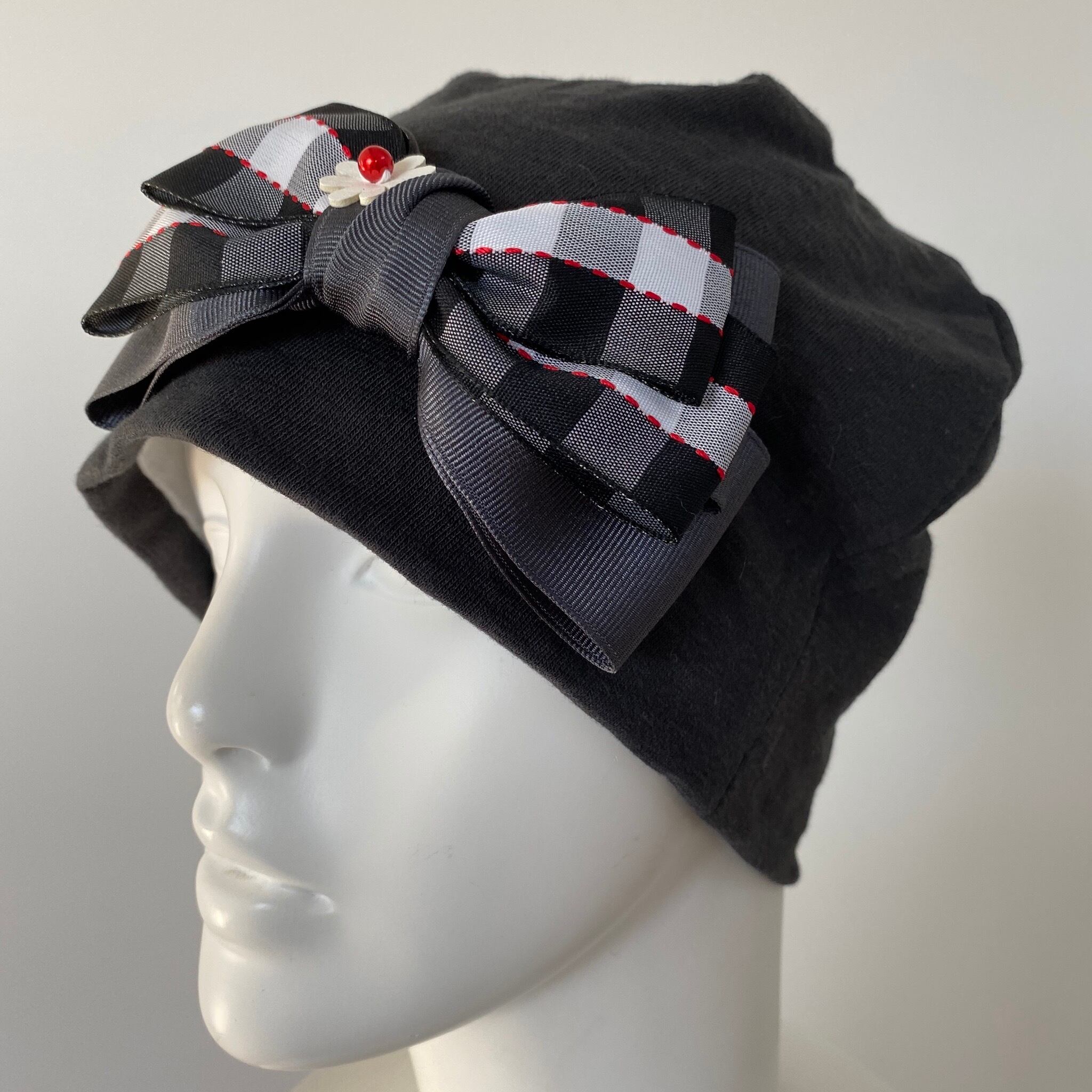肌触りの良い、伸縮性のあるコットン100%のお生地で作ったお帽子に、お花付きチェックリボンを付けた可愛いデザインです。