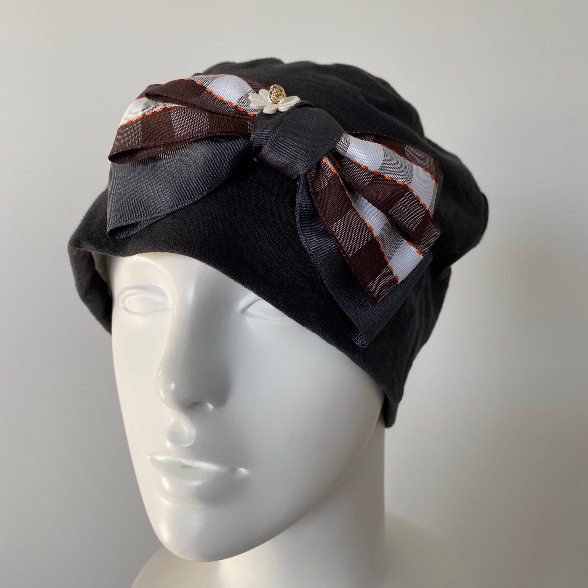 お花付きブラウンチェックリボンのケア帽子