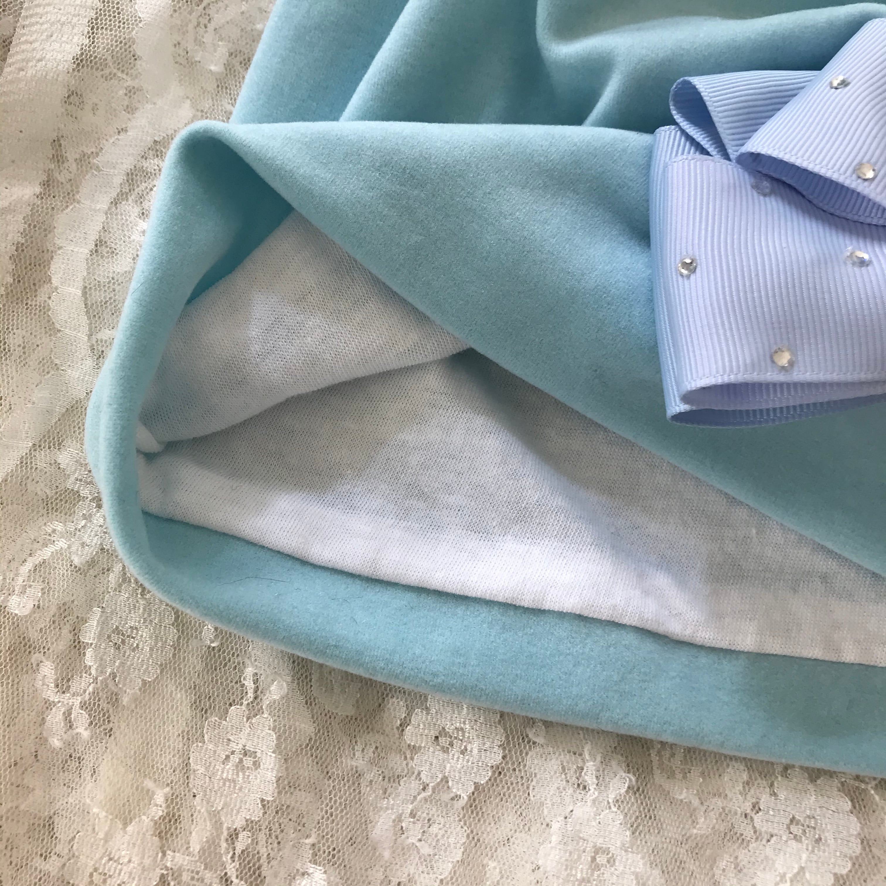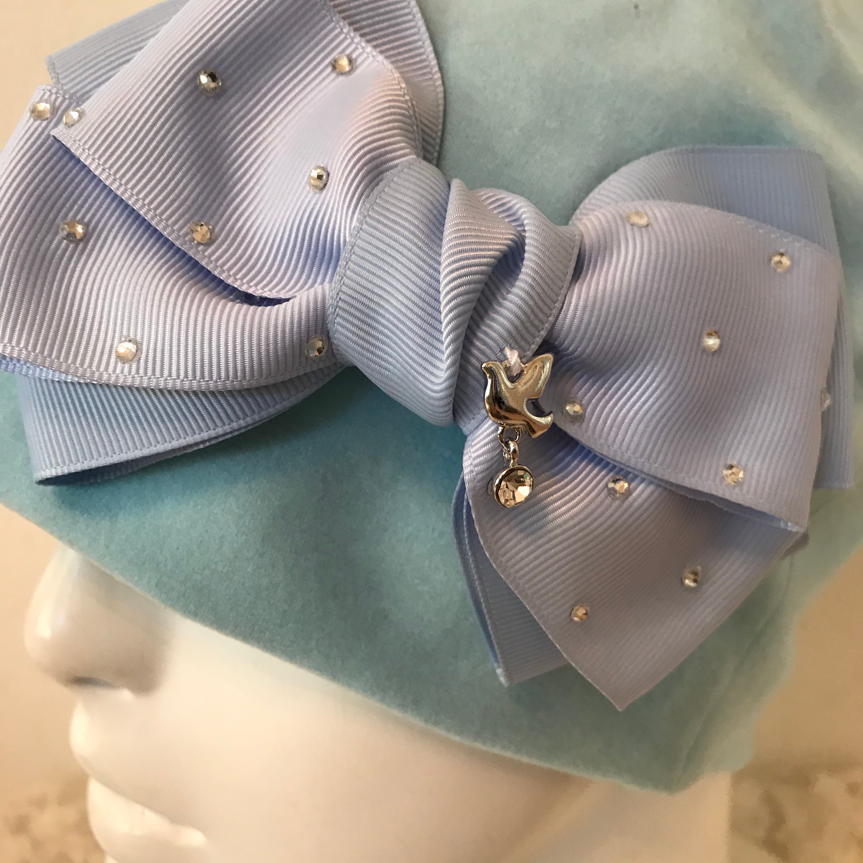 ビジュー付きチャームとラインストーンリボンのケア帽子 ベロア水色