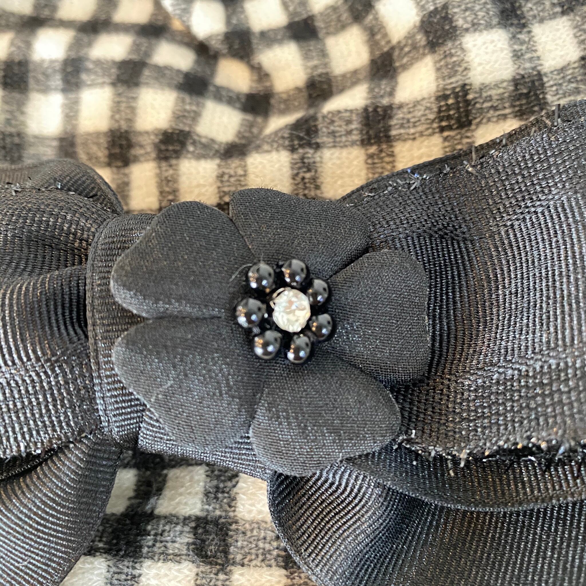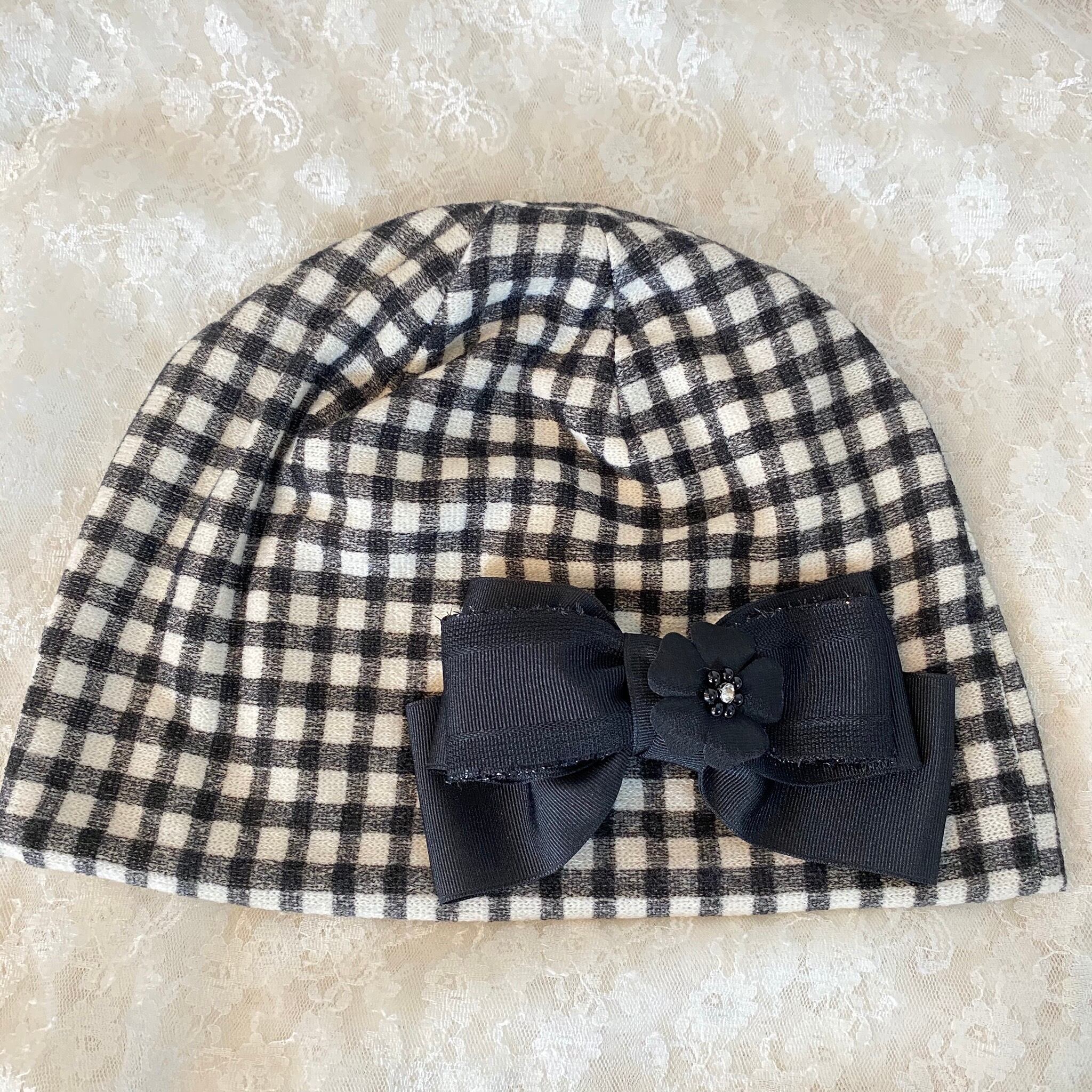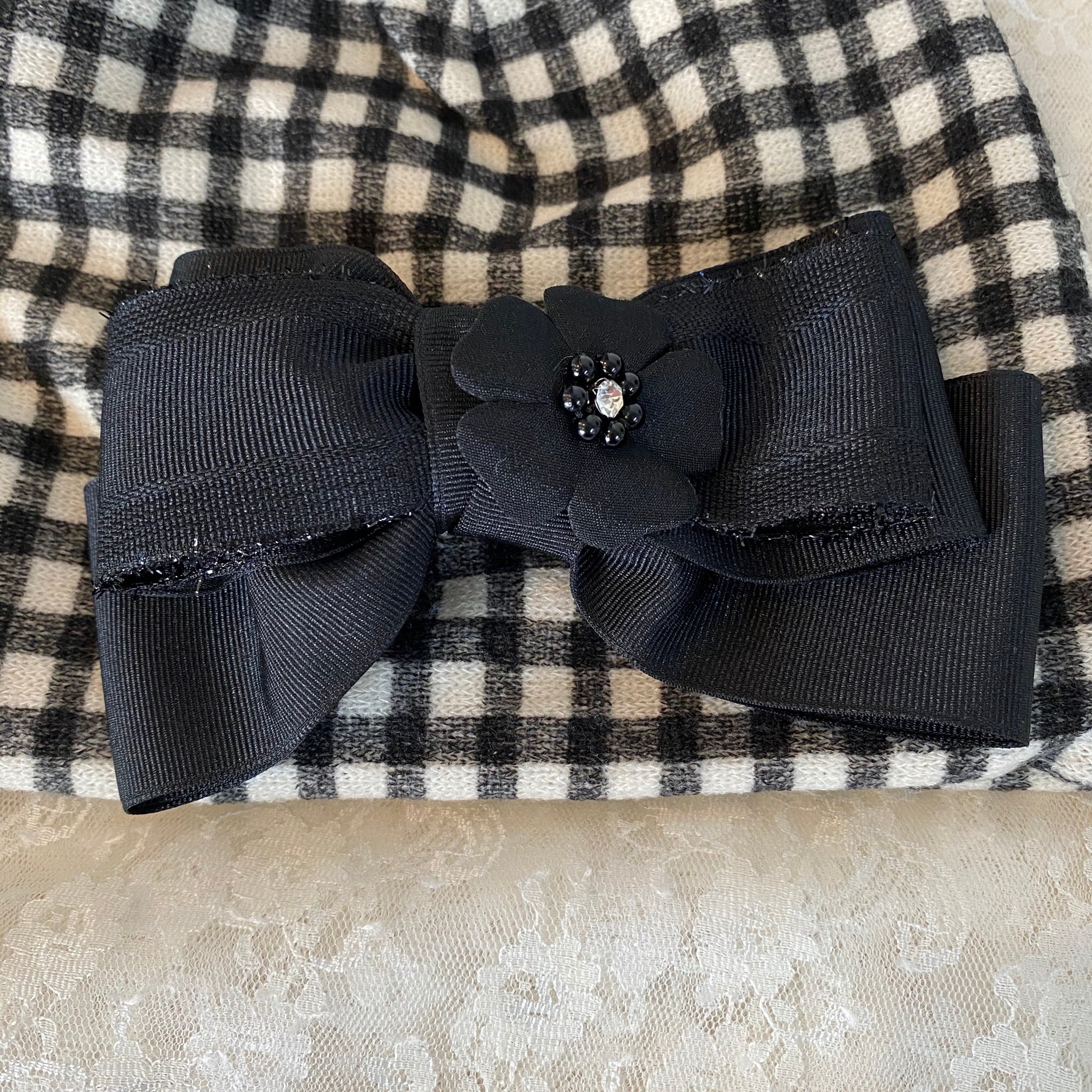 肌触りの良い、伸縮性のあるお生地で作ったお帽子に、おリボンとお花を付けた素敵なデザインです。