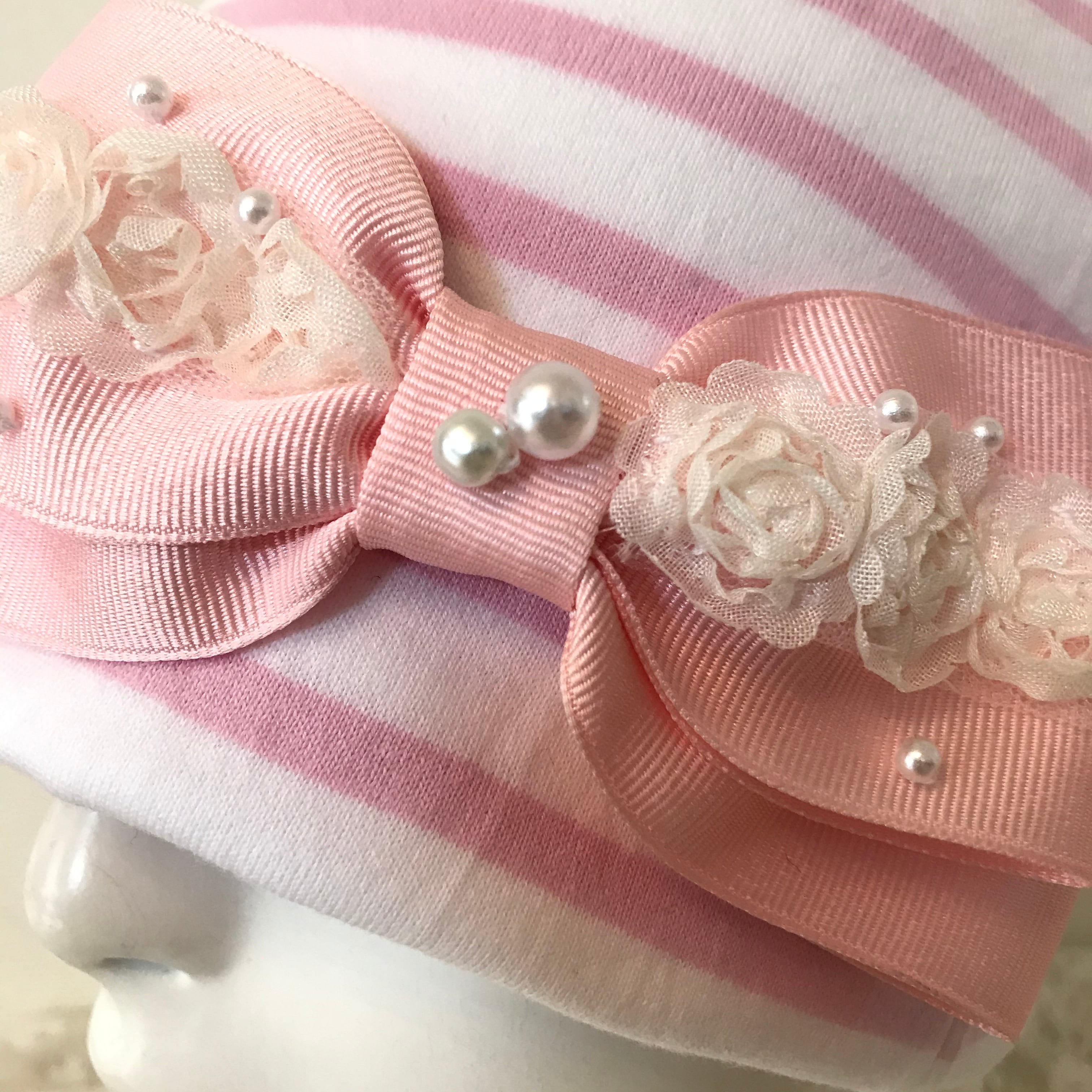 肌触りの良い、伸縮性のあるお生地で作ったお帽子に、薔薇チュールとパール付きグログランリボンを付けた素敵なデザインです。