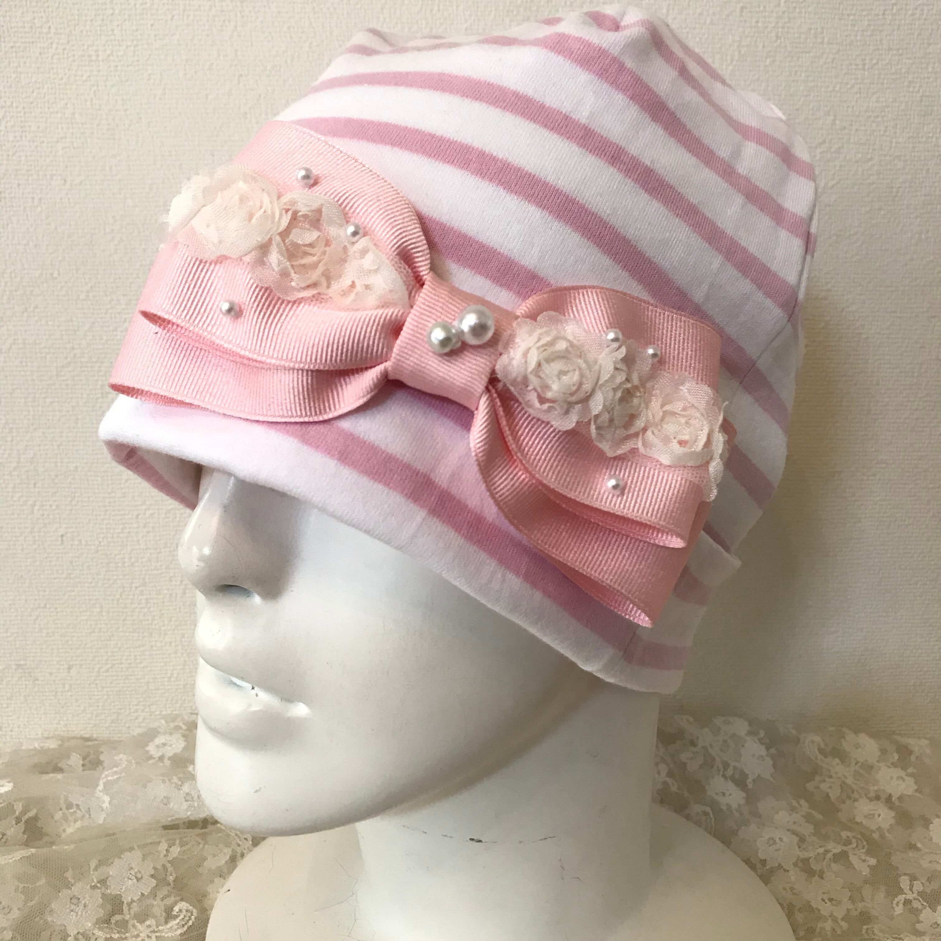 薔薇チュールとバールのケア帽子 ピンクボーダー