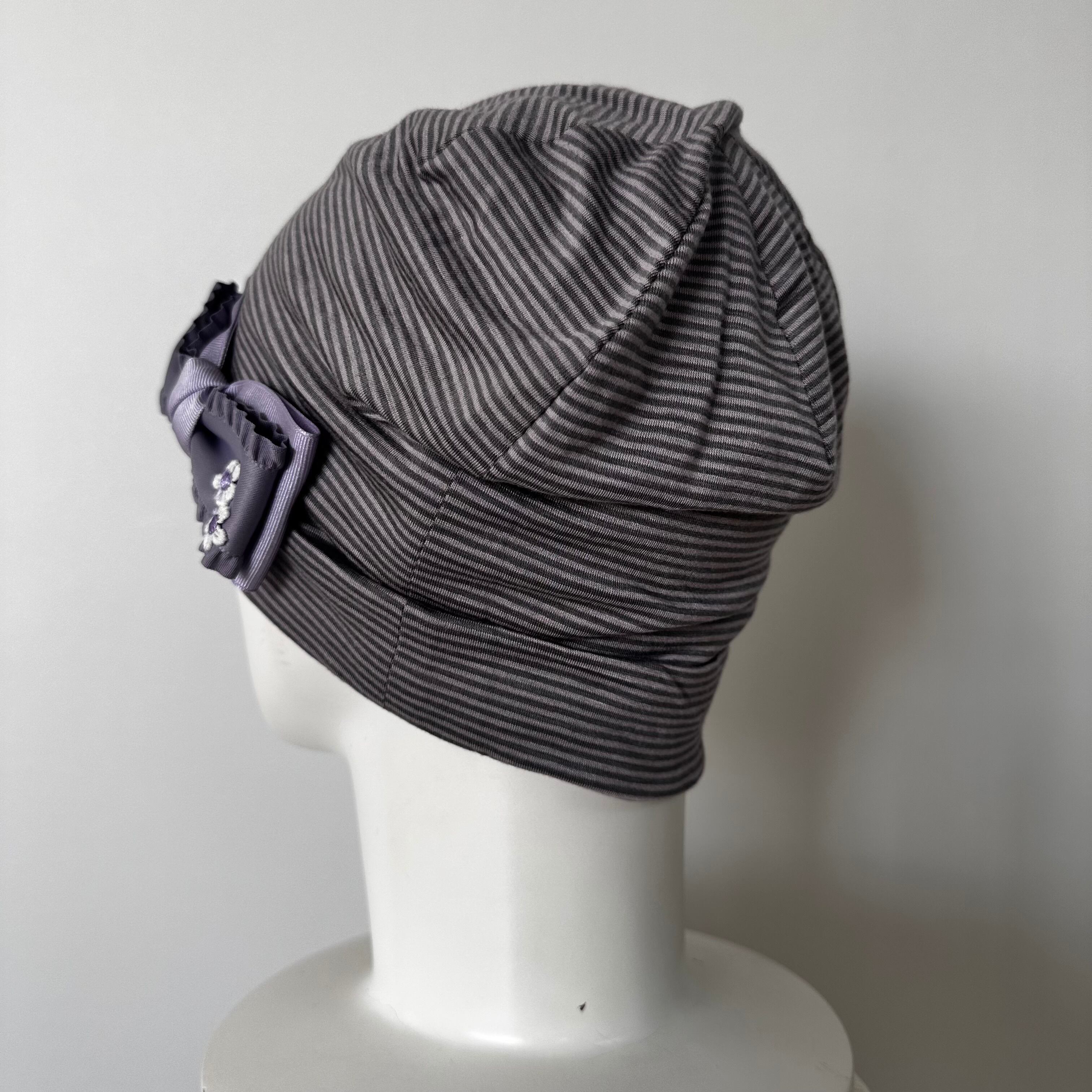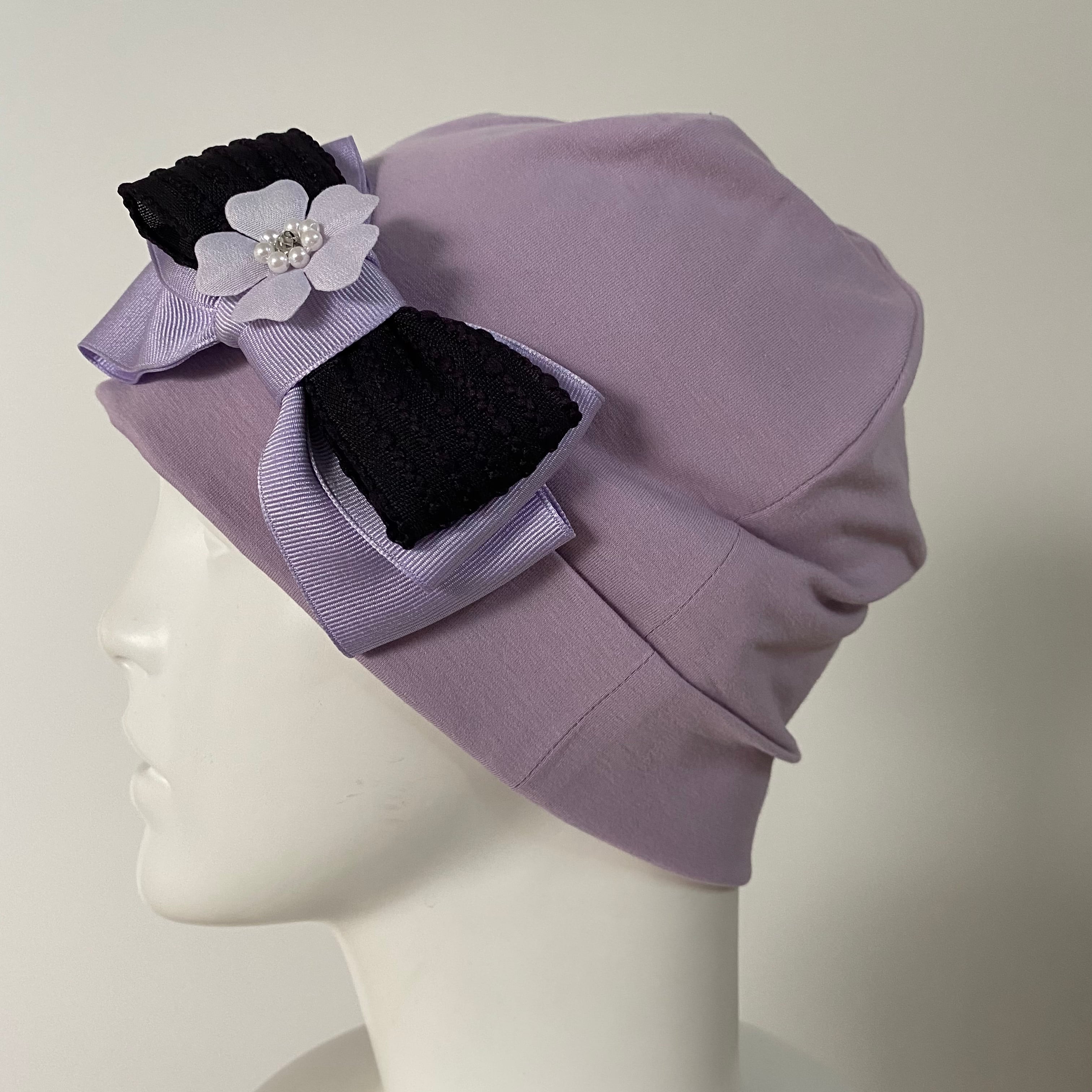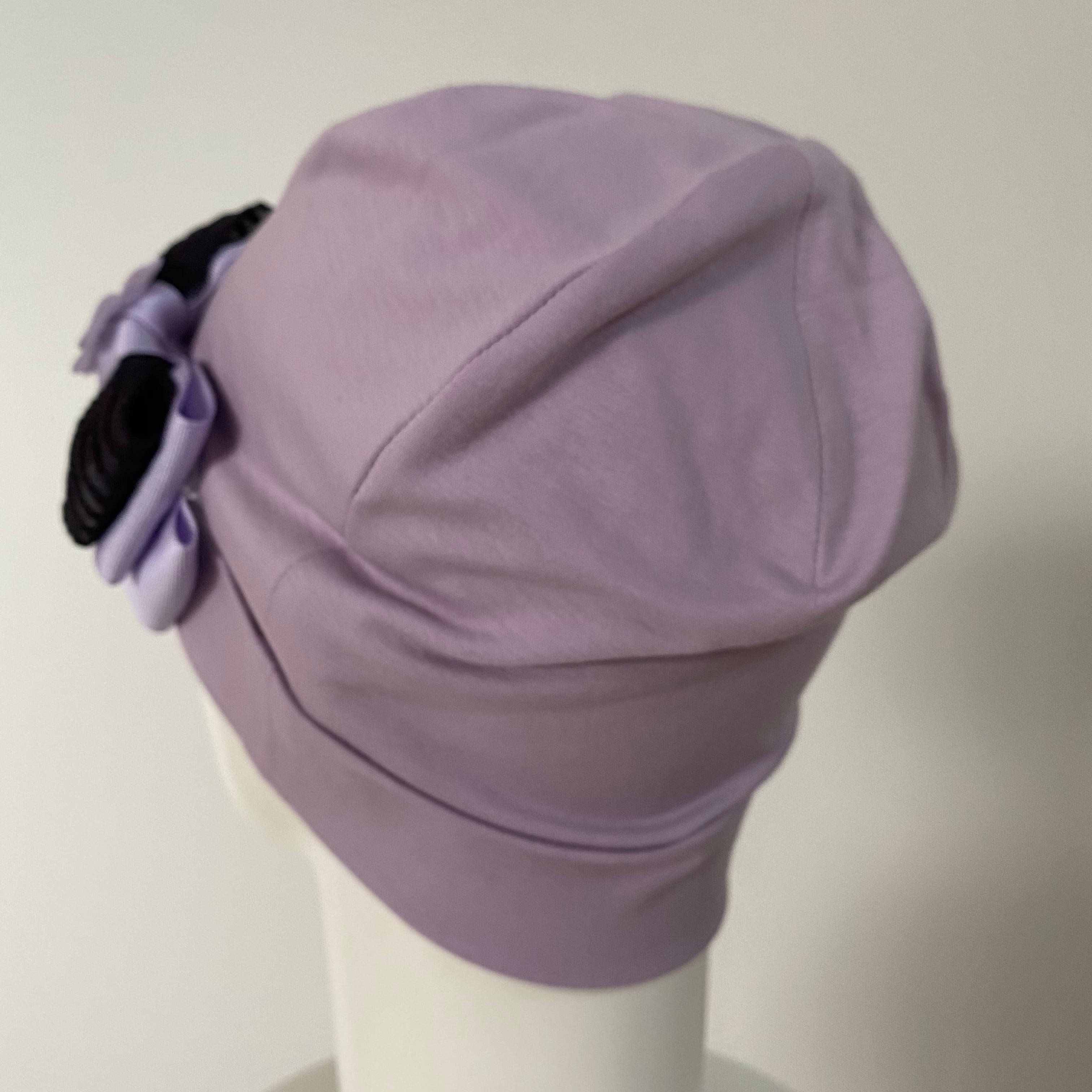 肌触りの良い、伸縮性のあるお生地で作ったお帽子に、おリボンを付けた素敵なデザインです。