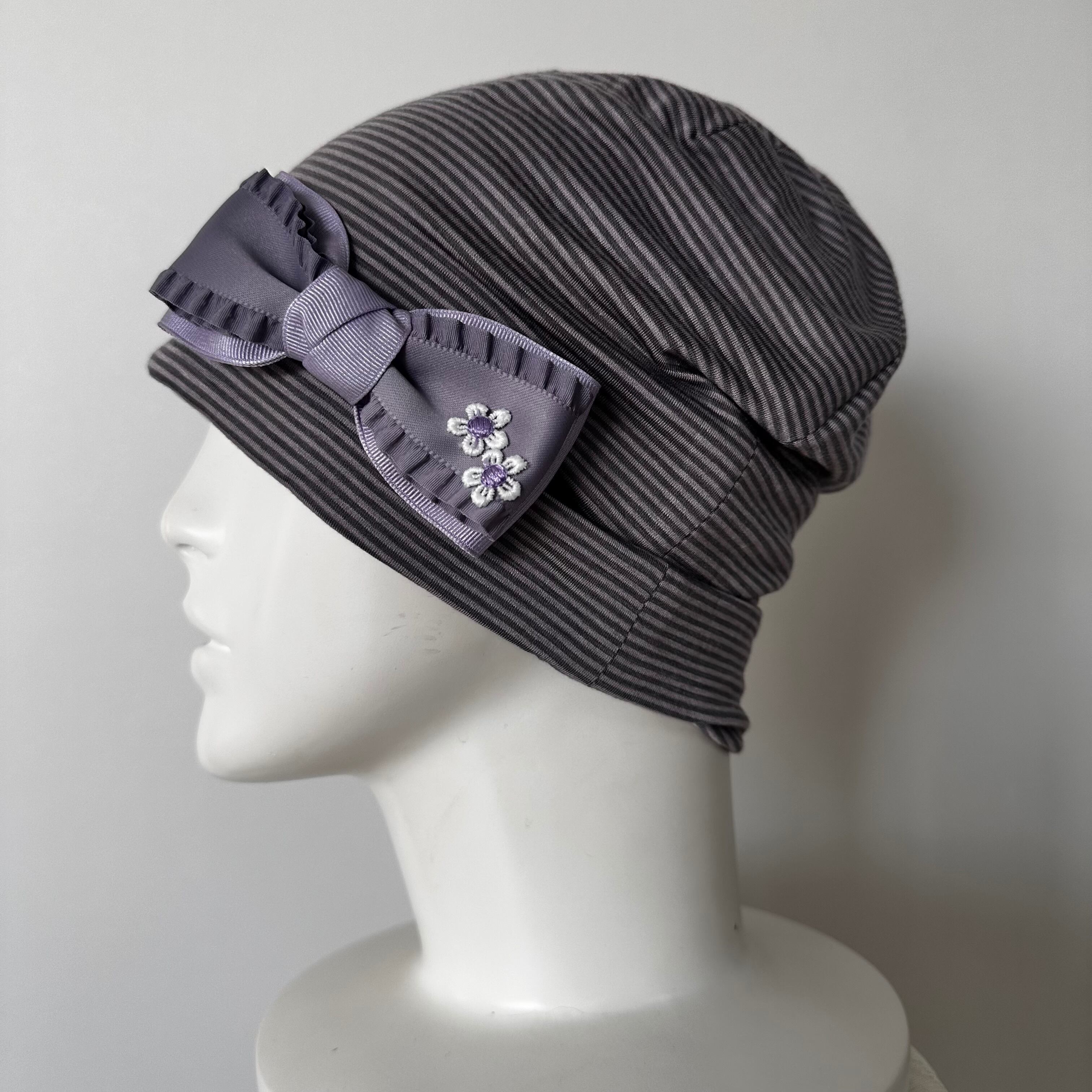 フリルリボンとお花のケア帽子 パープル✖️グレー