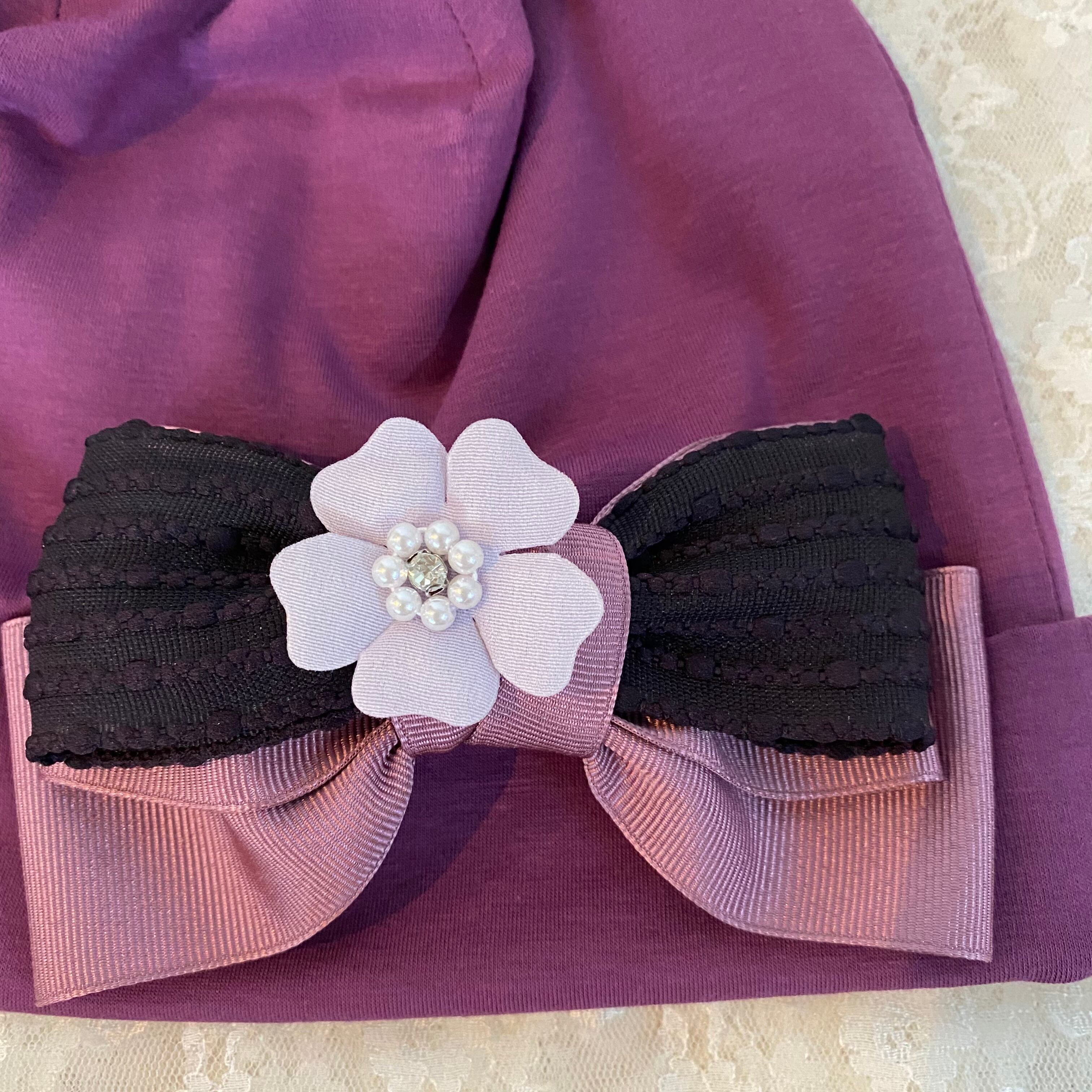 肌触りの良い、伸縮性のあるお生地で作ったお帽子に、おリボンを付けた素敵なデザインです。
