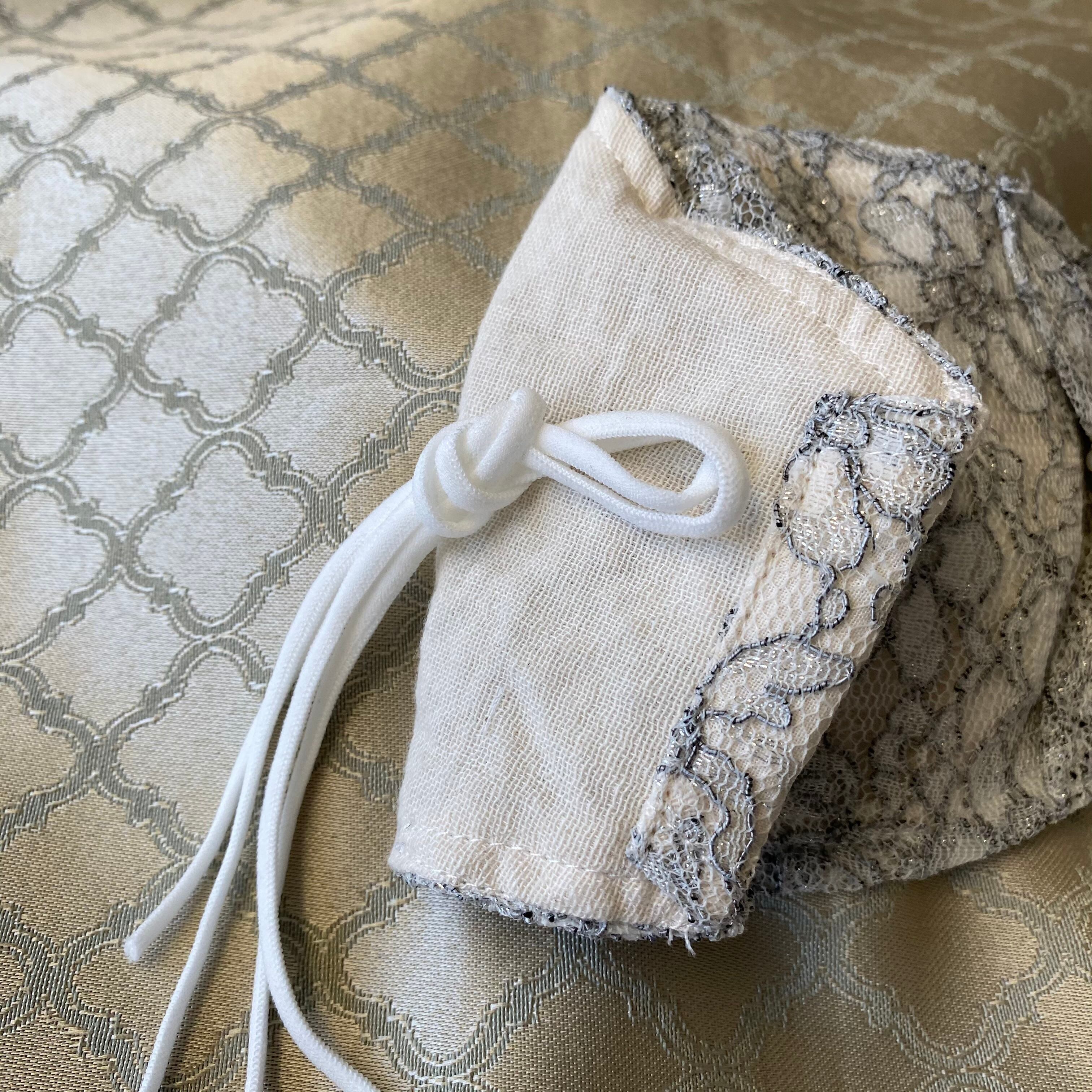 肌触りの良い二重ガーゼとレース生地を使ったマスクカバーです。ゴムを通す所がありゴムもお付けしておりますのでマスクとしてもお使い頂けます。