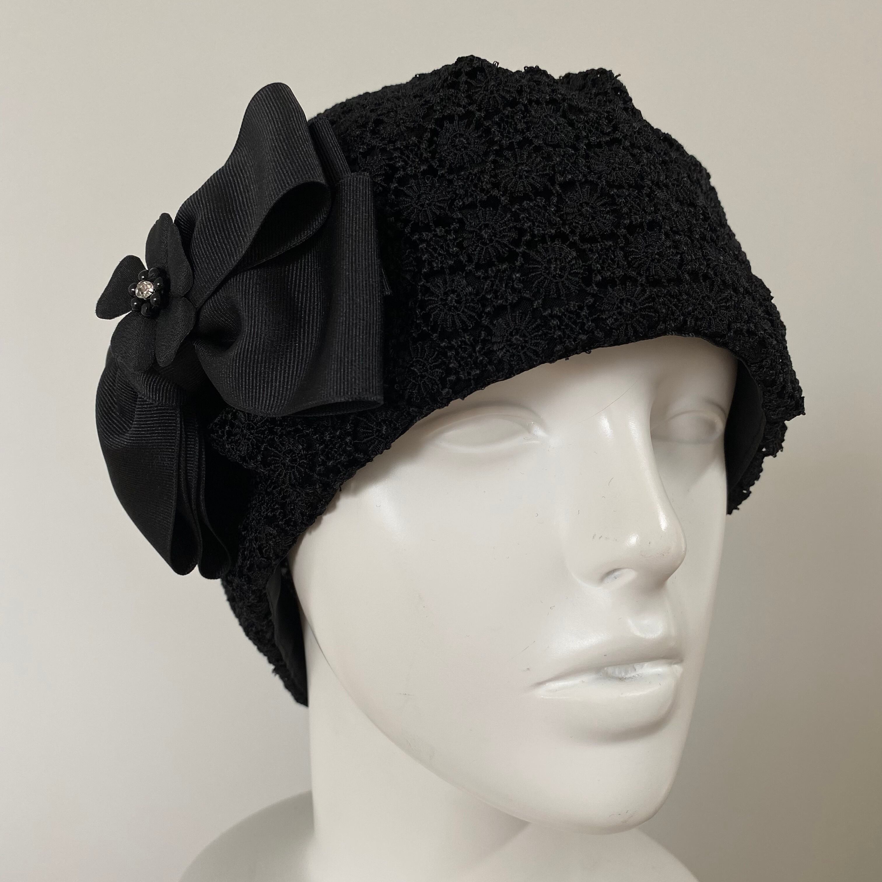 お生地たっぷりベレー帽黒レースお花モチーフ