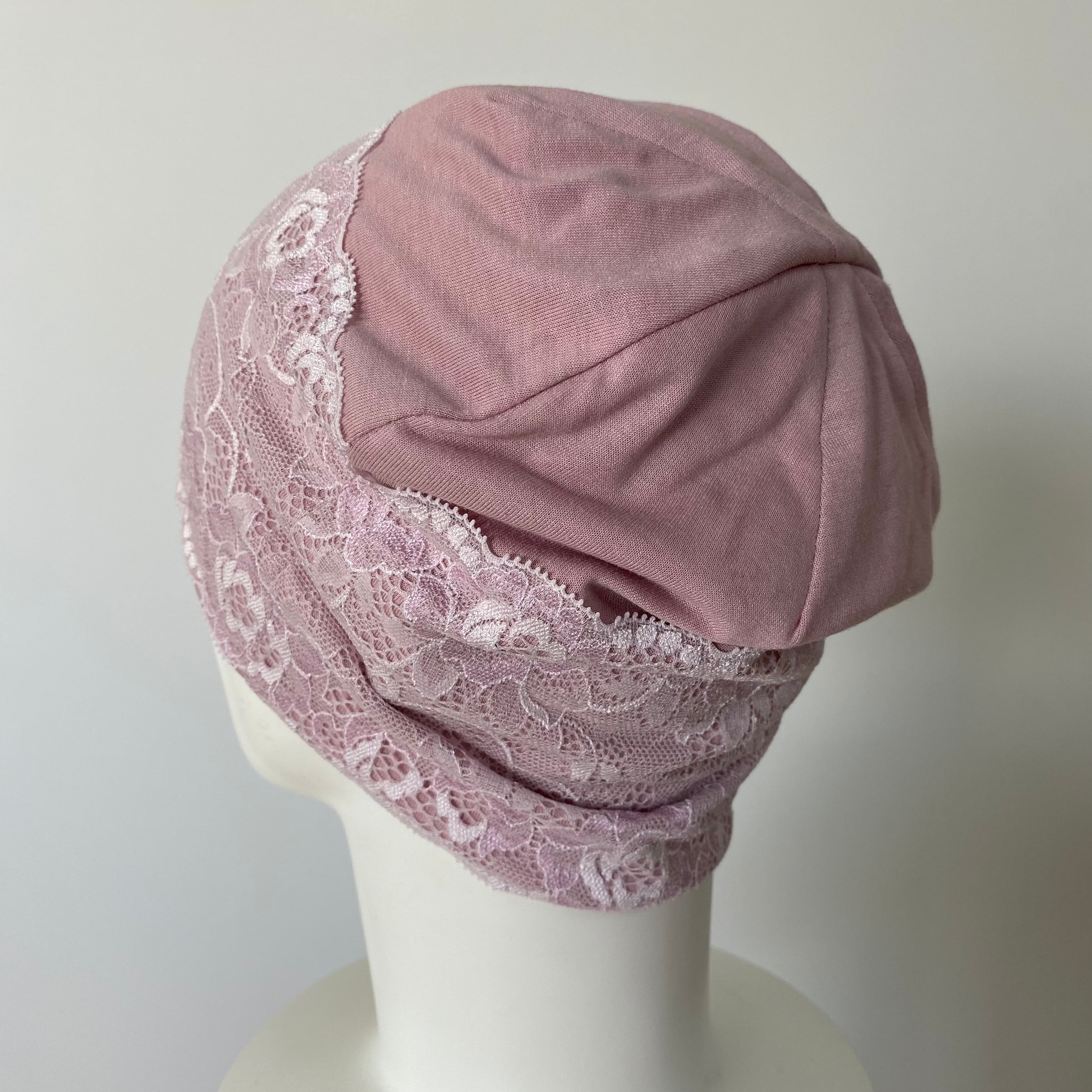 クールマックス生地で作ったお帽子に、レースを付けた上品なデザインです。