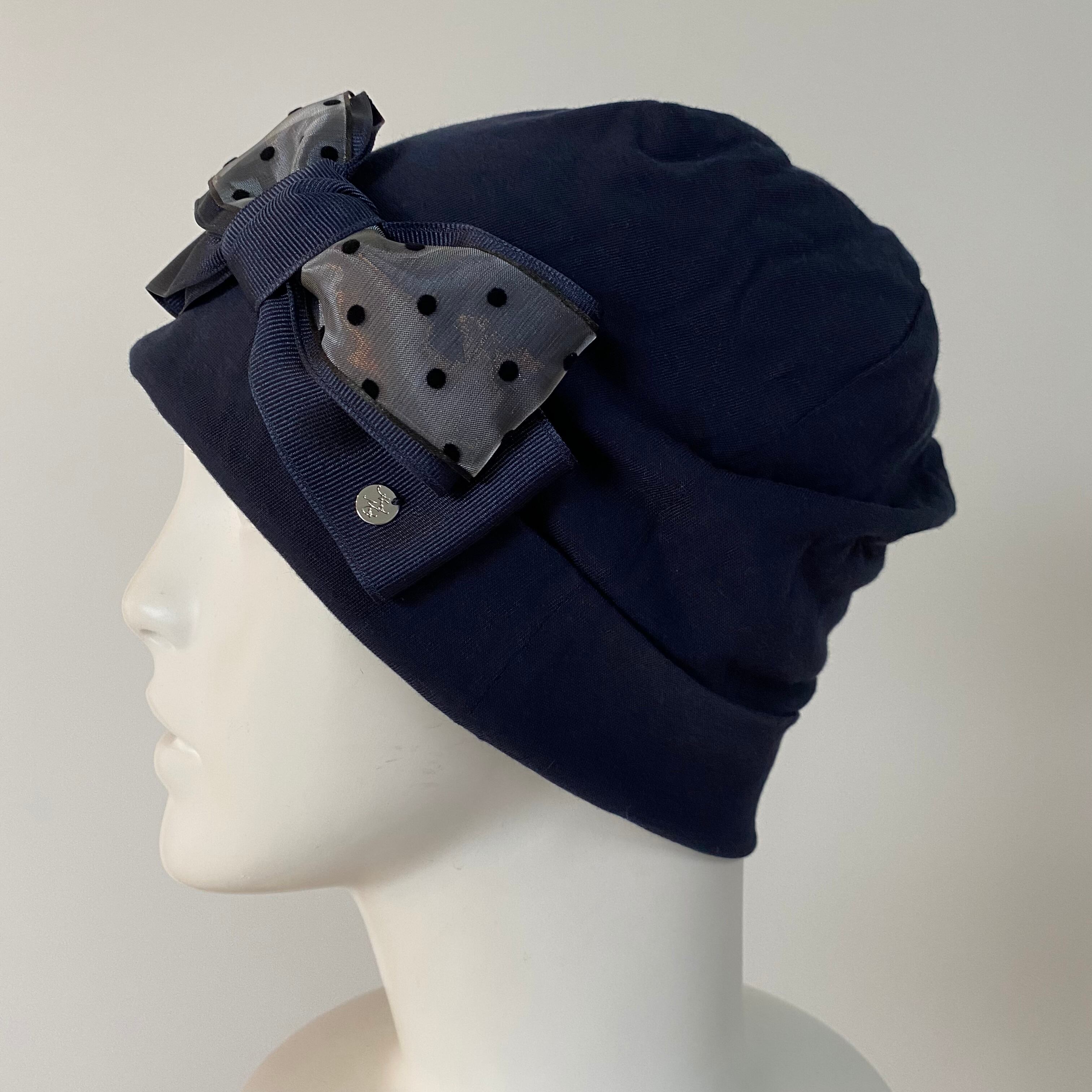 肌触りの良い、伸縮性のあるお生地で作ったお帽子に、水玉チュールリボン、グログランリボンを付けた素敵なデザインです。