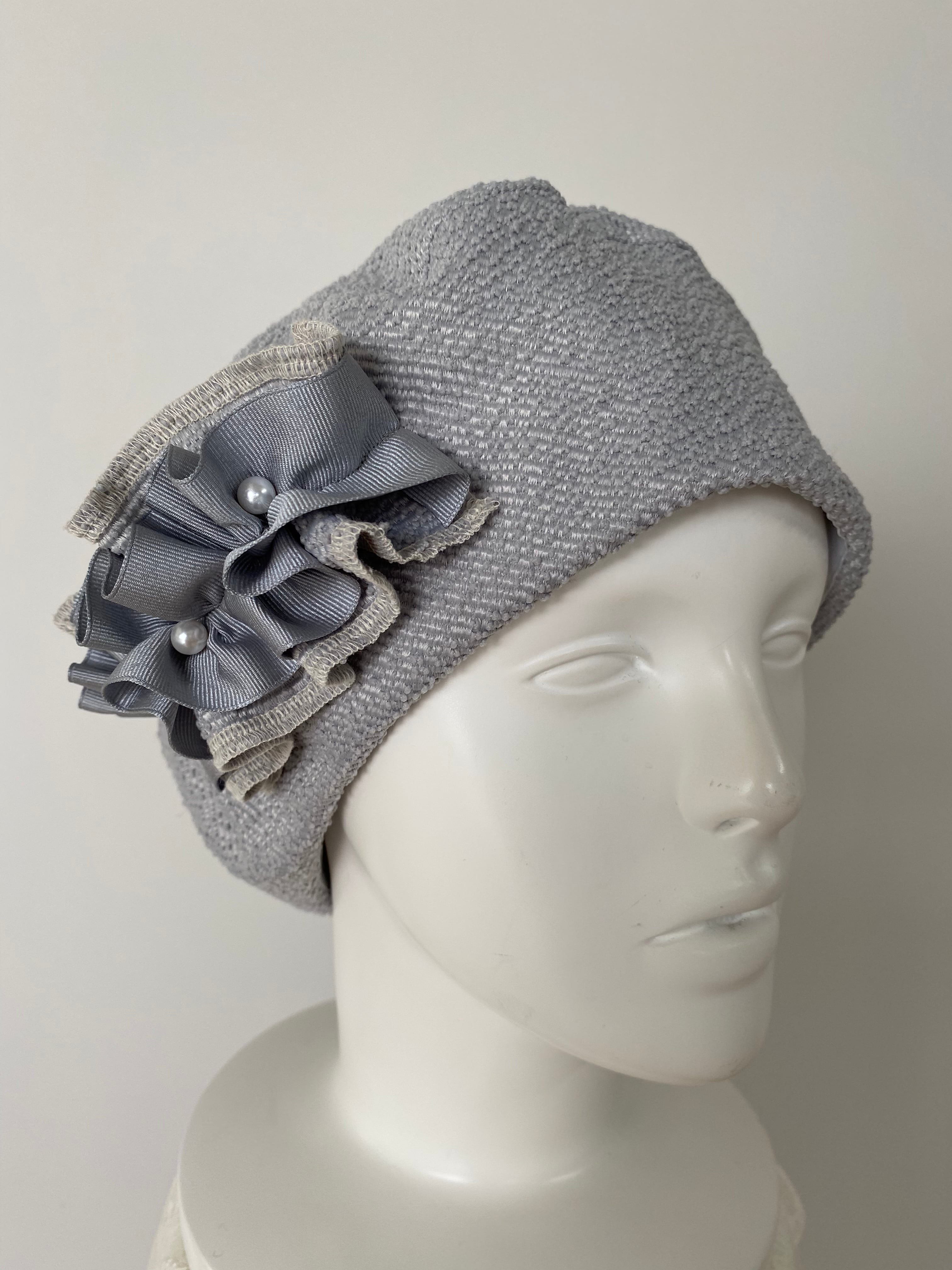 被り口にはグログランリボンを巻いておりますので伸縮性はございませんが後ろに少しゴムをお付けしております。
