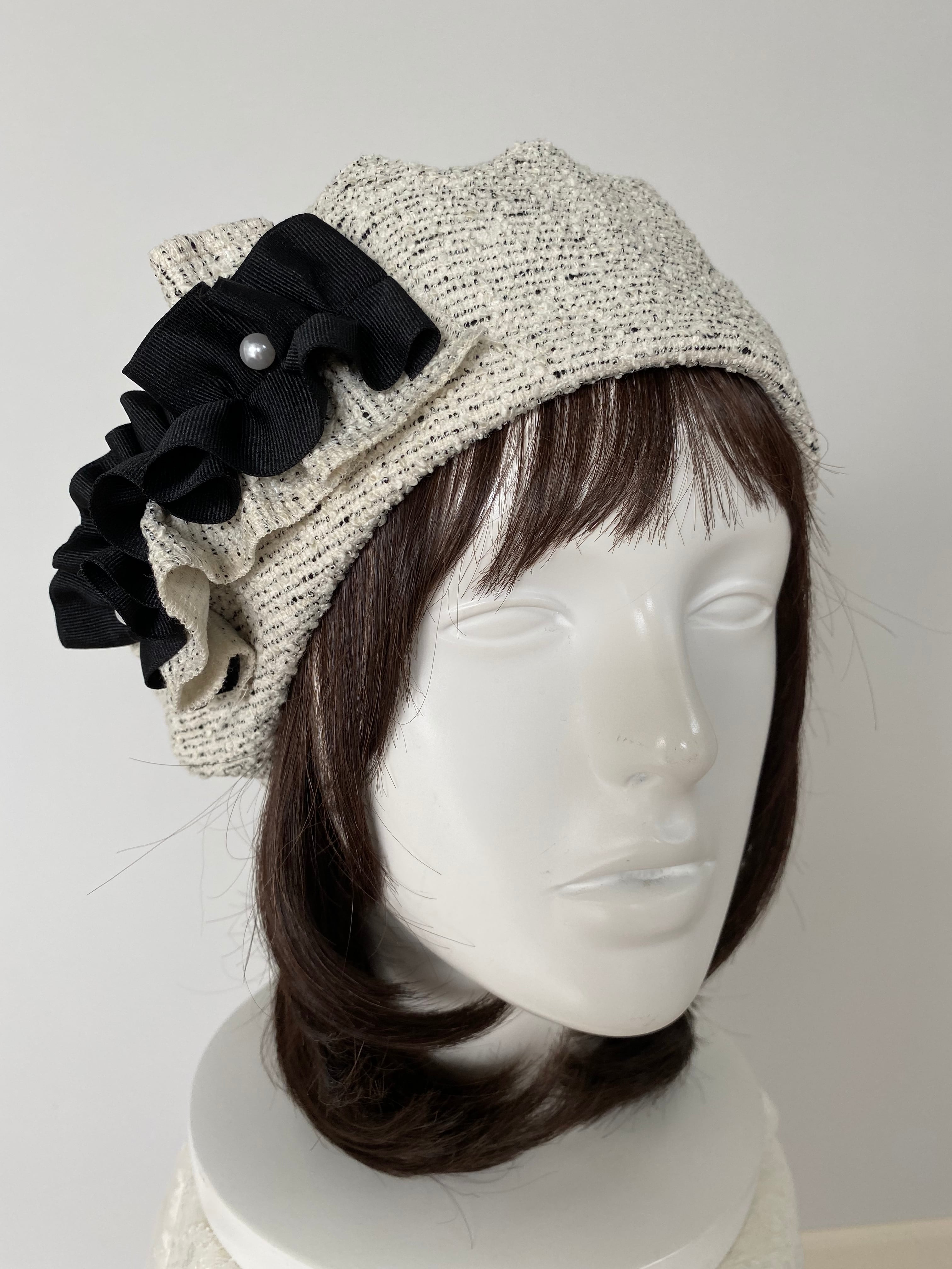 お生地たっぷりベレー帽 フリルリボン ツィードホワイト系
