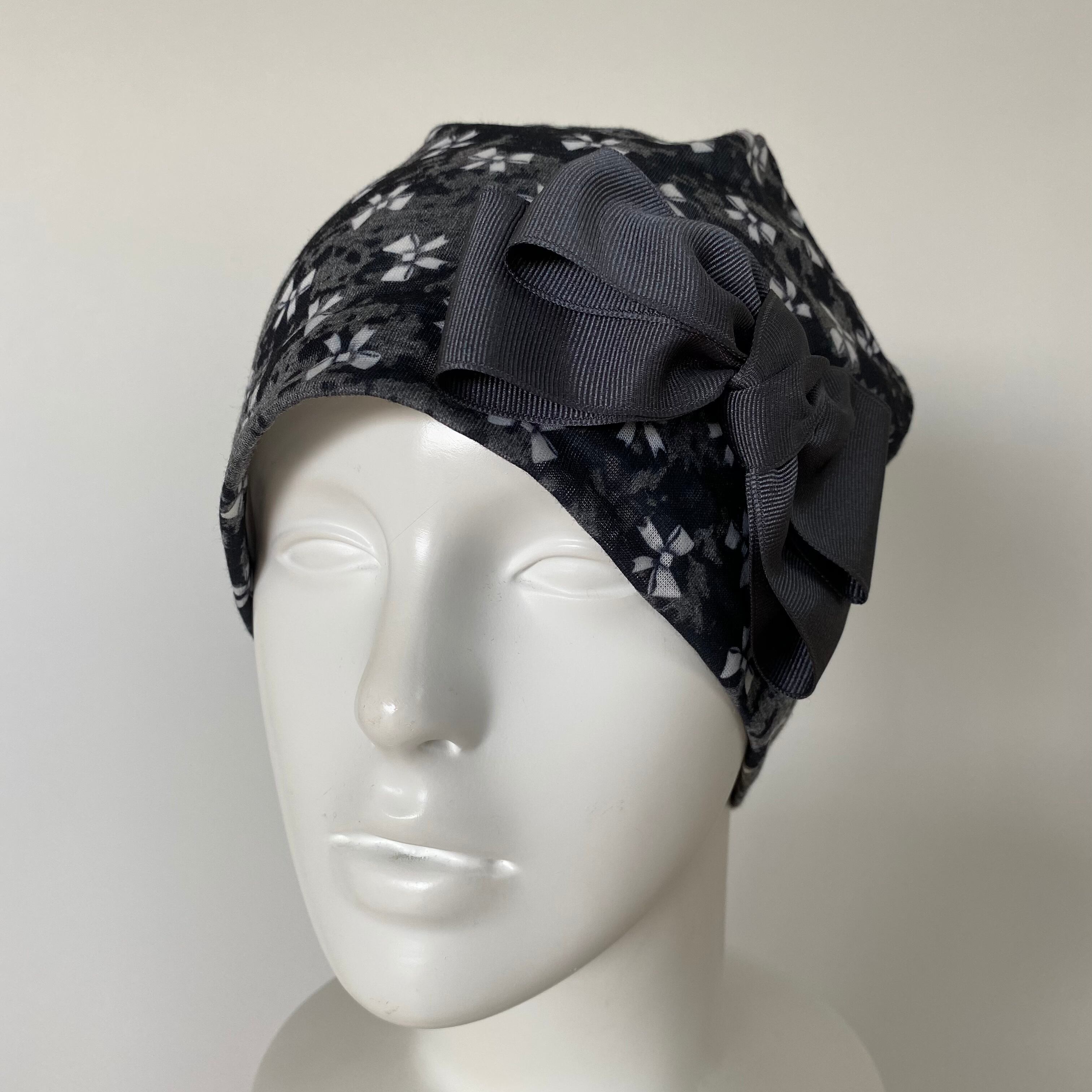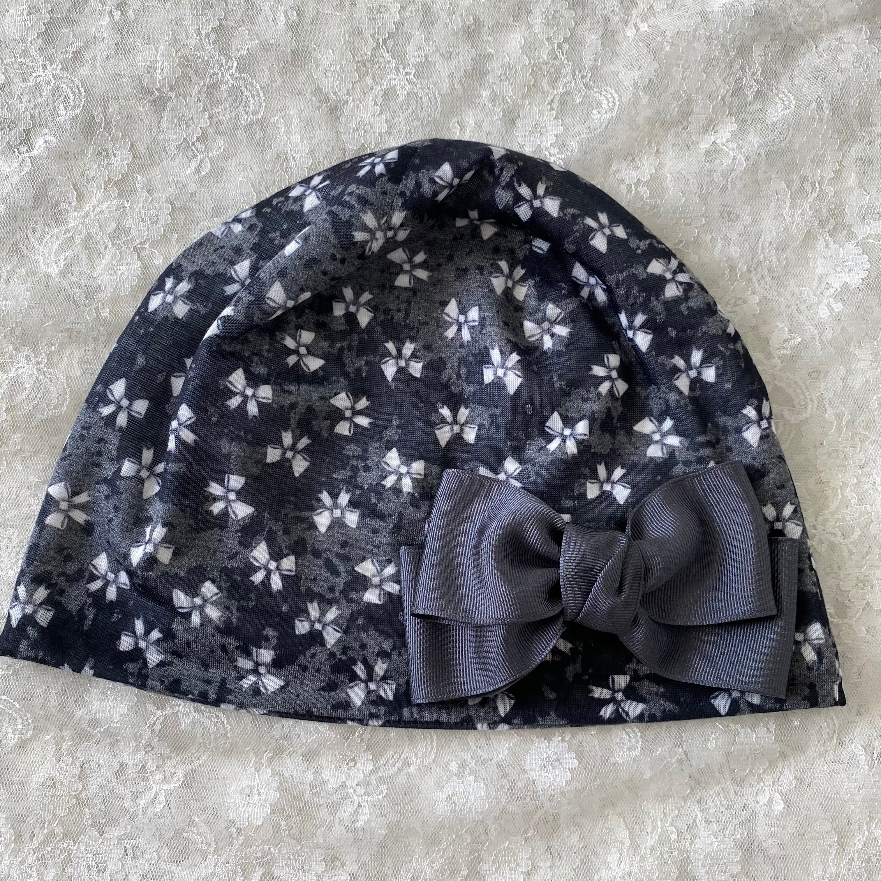 伸縮性のあるリボン柄生地の内側はコットン100%のお生地で仕上げております。そのお帽子にシンプルリボンを付けた可愛いデザインです。