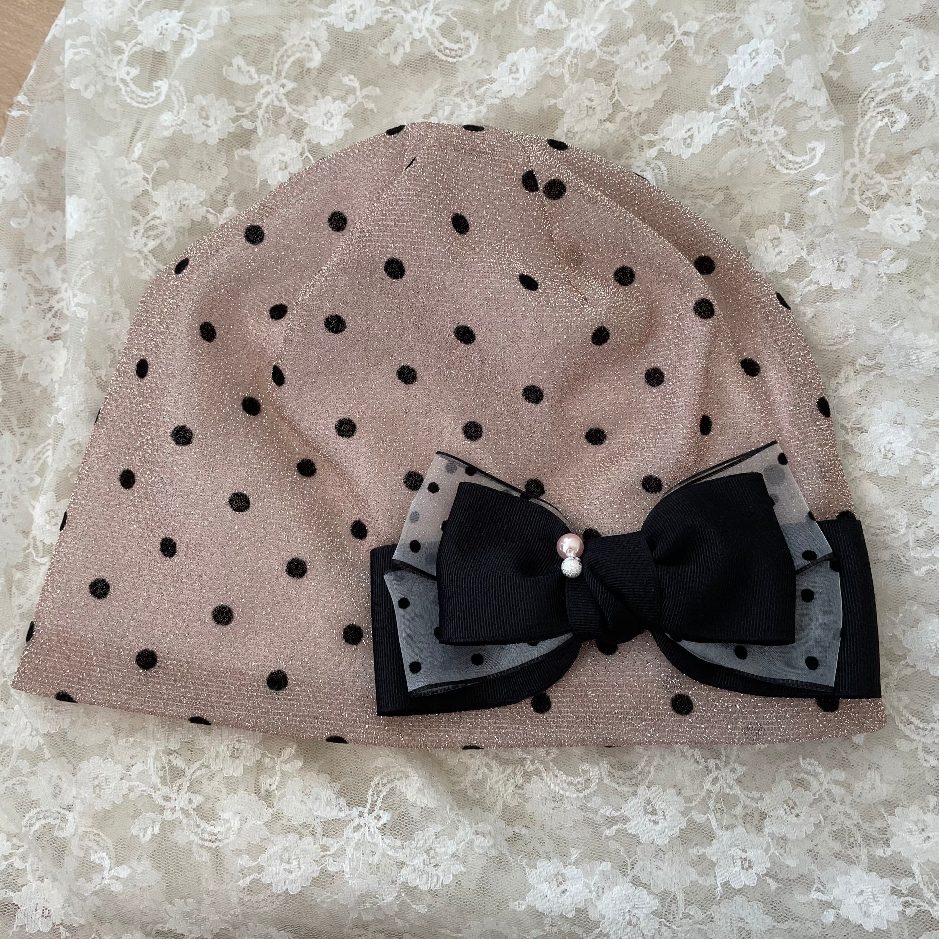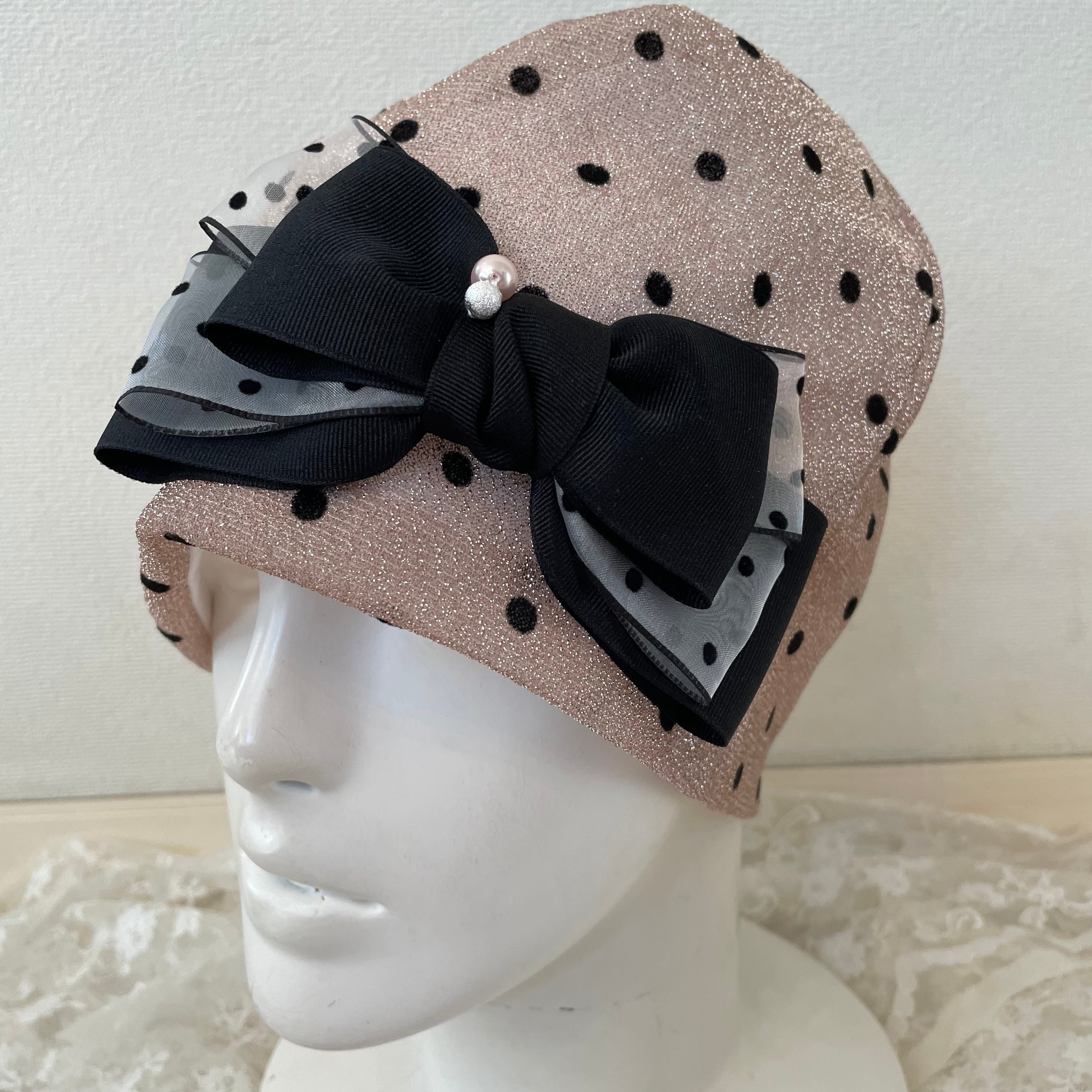 チュールリボンとピンクパールのケア帽子 ラメドット ピンク系
