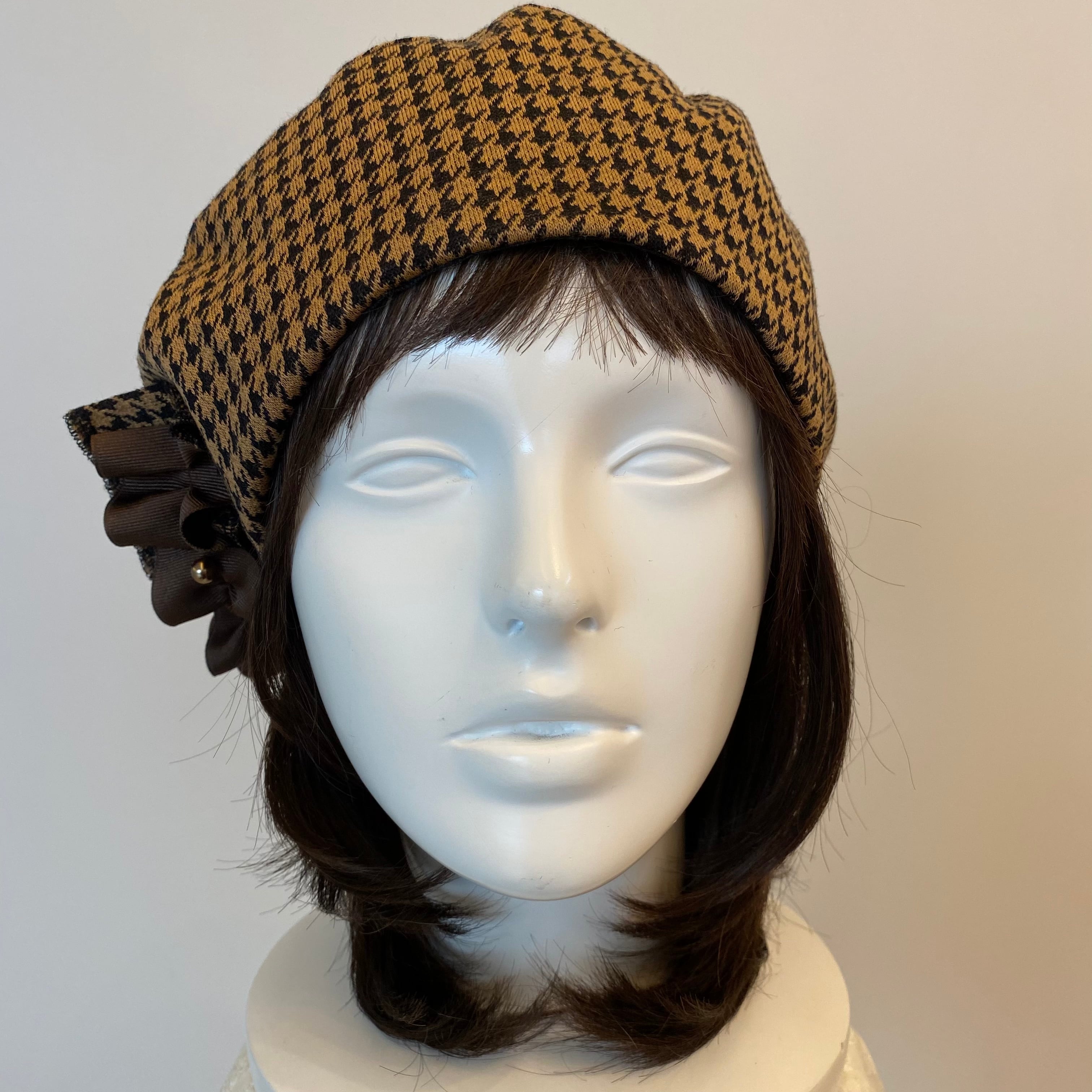 お生地たっぷりベレー帽 フリルリボン 千鳥格子 茶系