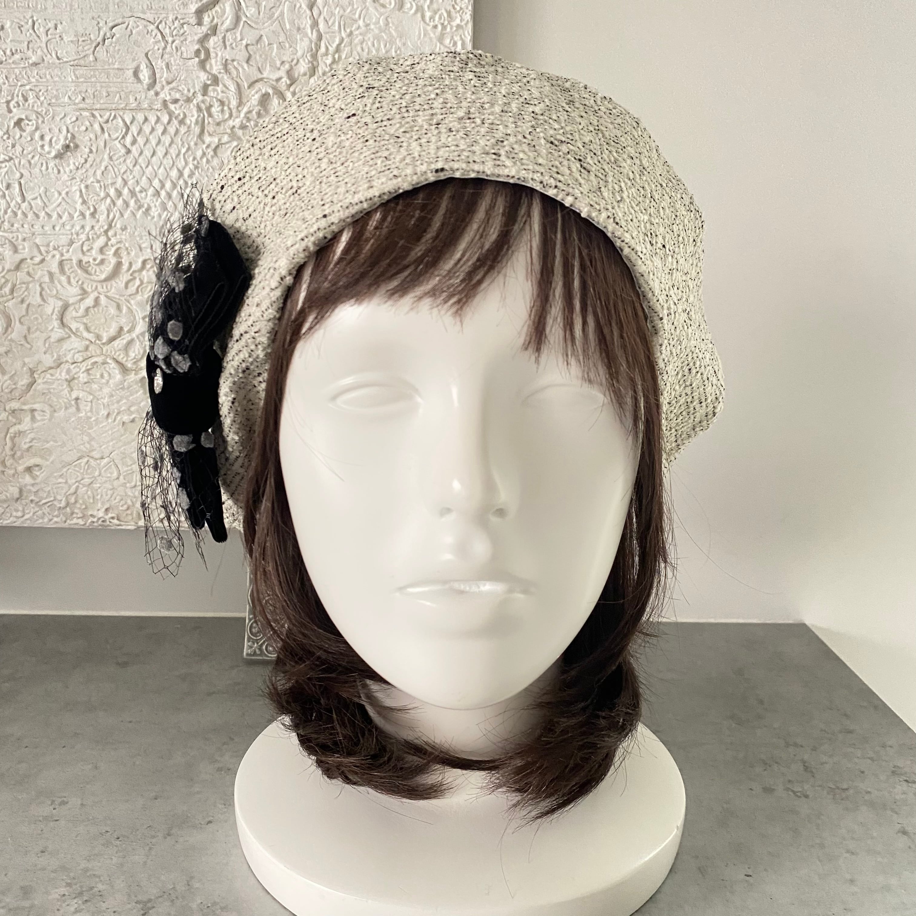 被り口にはグログランリボンを巻いており後ろに少しゴムが入っております。
