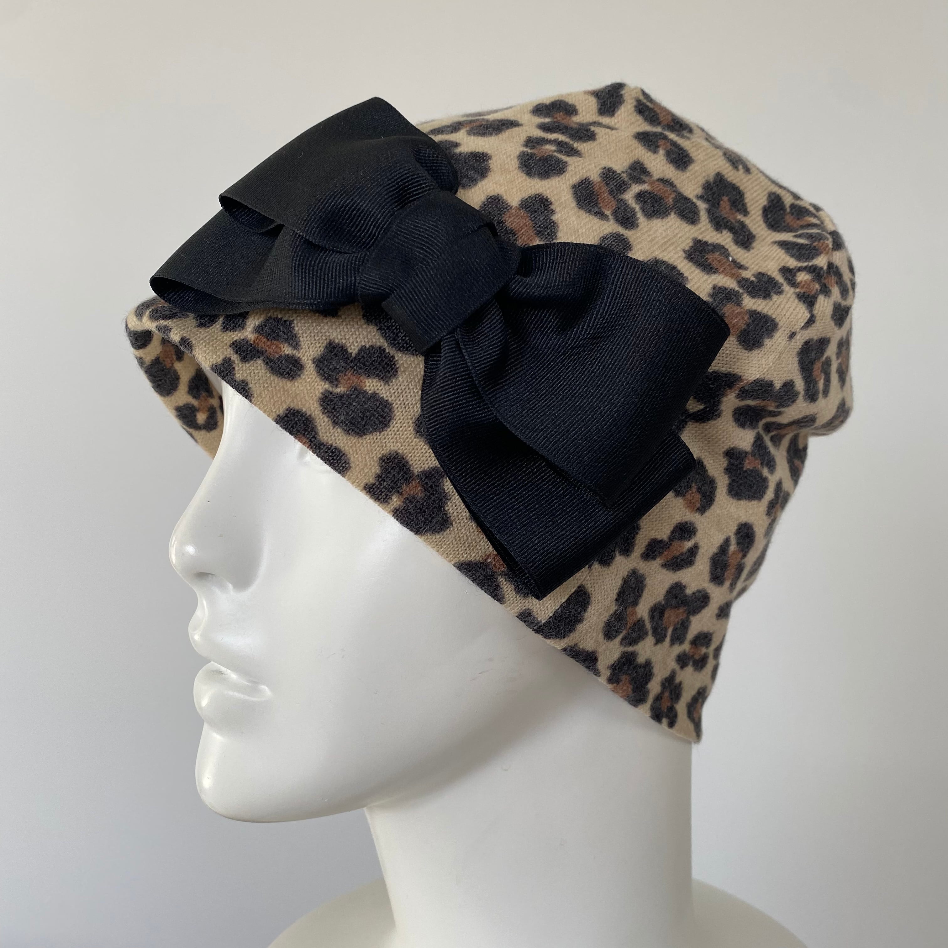 伸縮性のあるあったかレオパード柄生地の内側はコットン100%のお生地で仕上げております。そのお帽子にシンプルリボンを付けた可愛いデザインです。