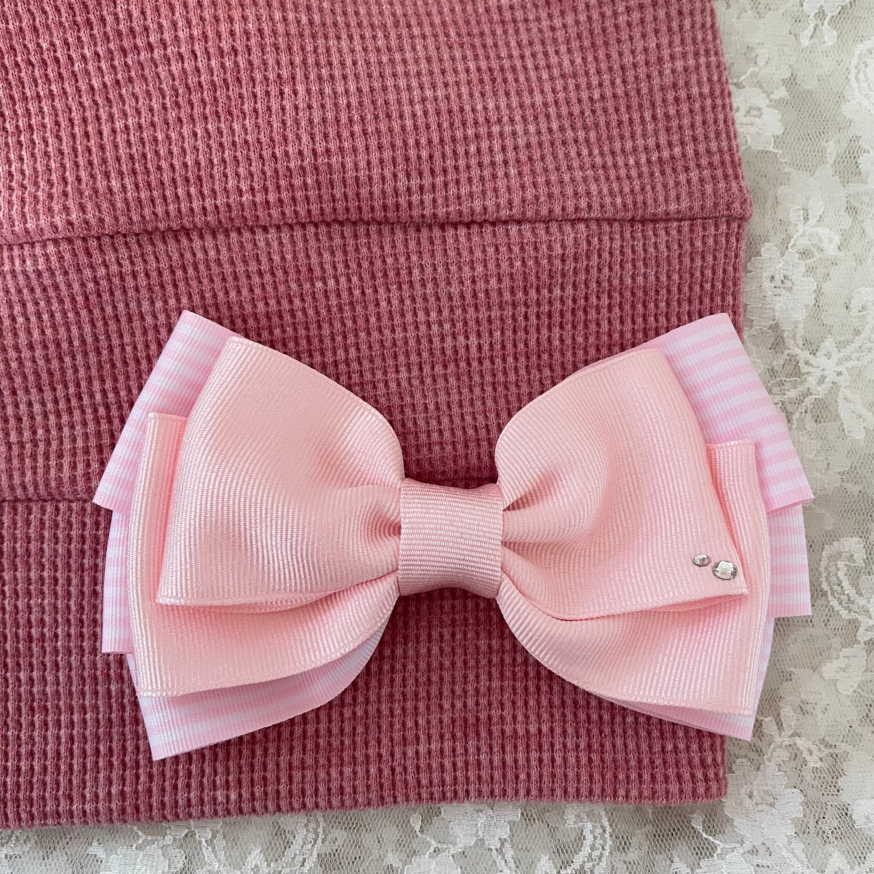 オーガニックコットンワッフル生地段々ワッチ スワロフスキーとストライプリボン付き ピンク