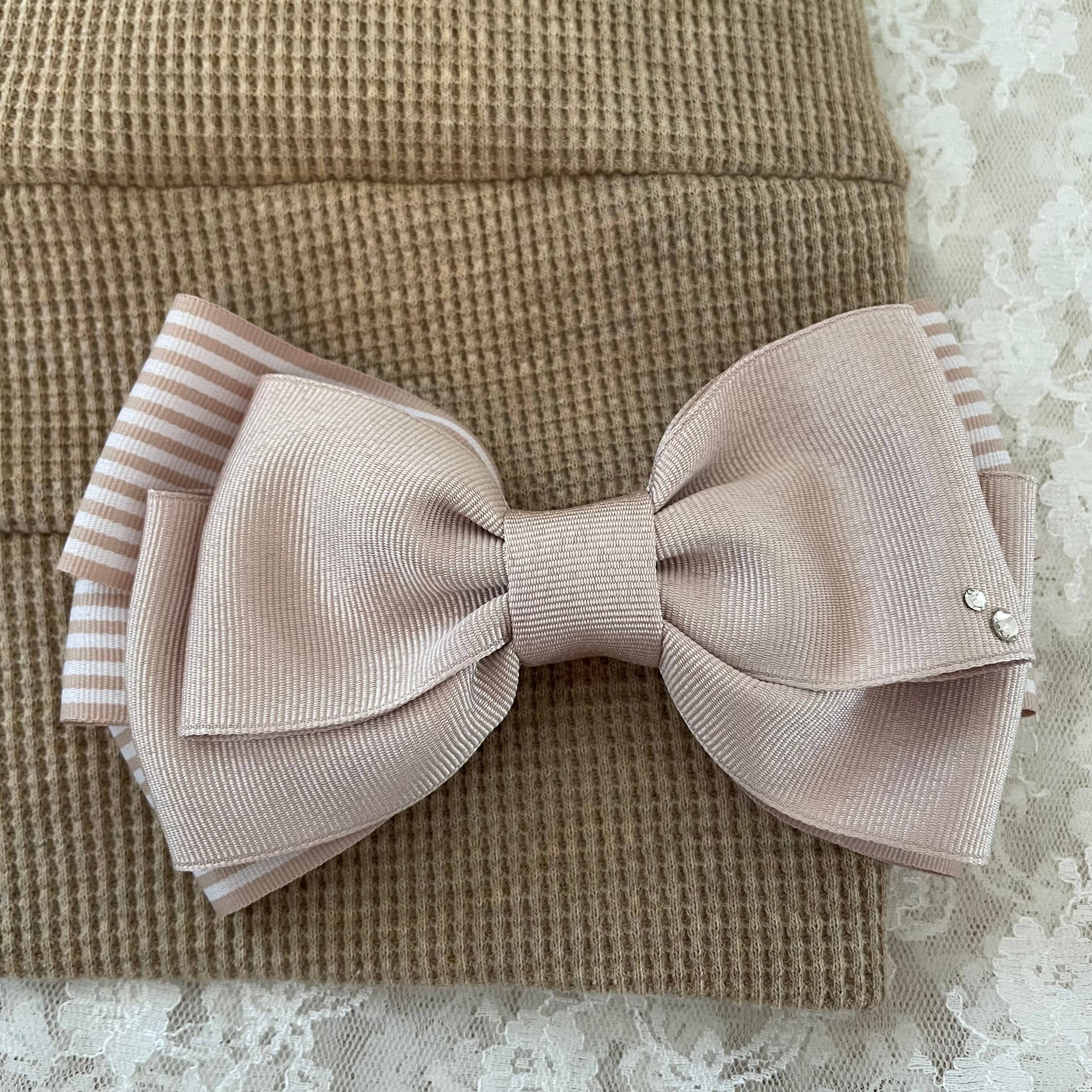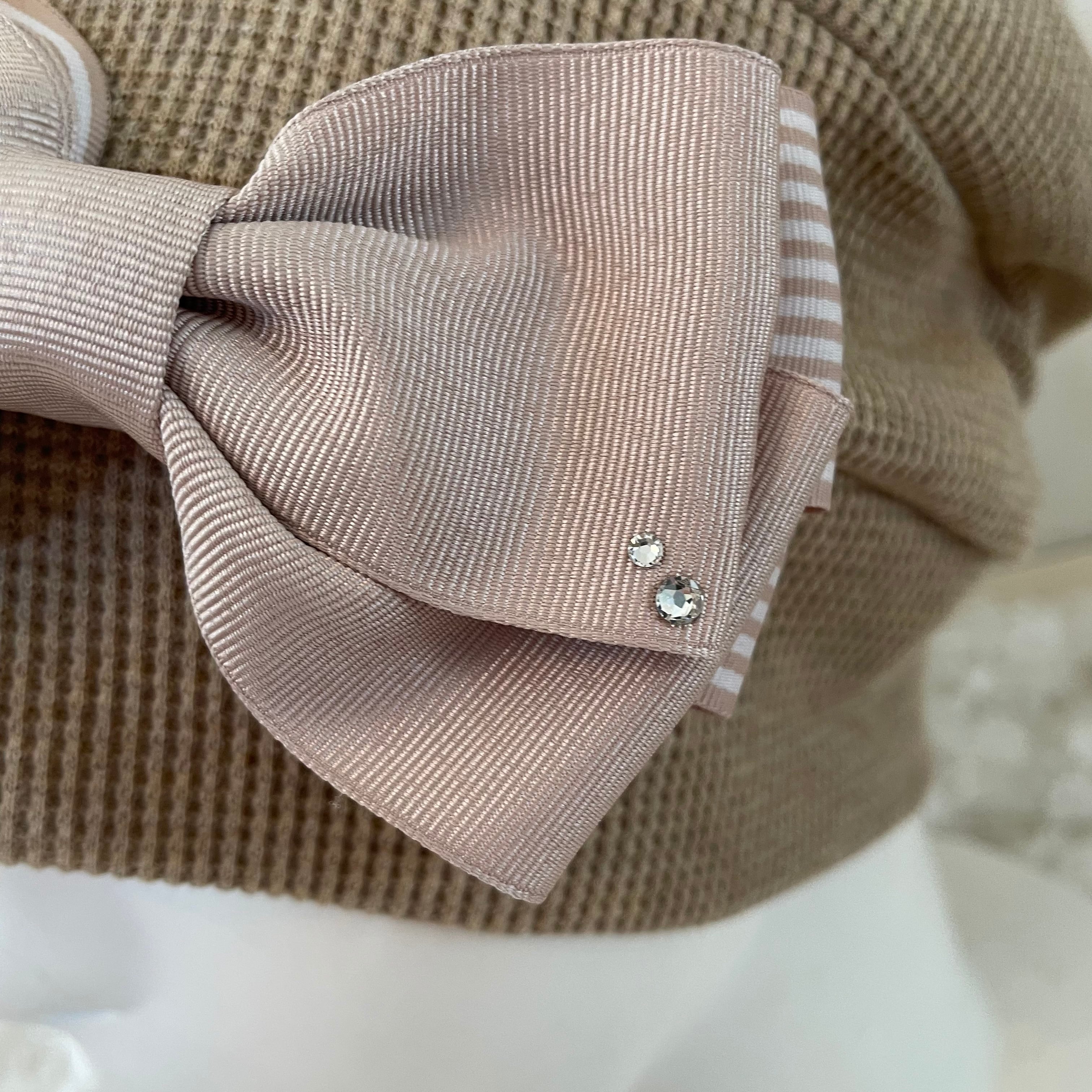 オーガニックコットンワッフル生地段々ワッチ スワロフスキーとストライプリボン付き ベージュ