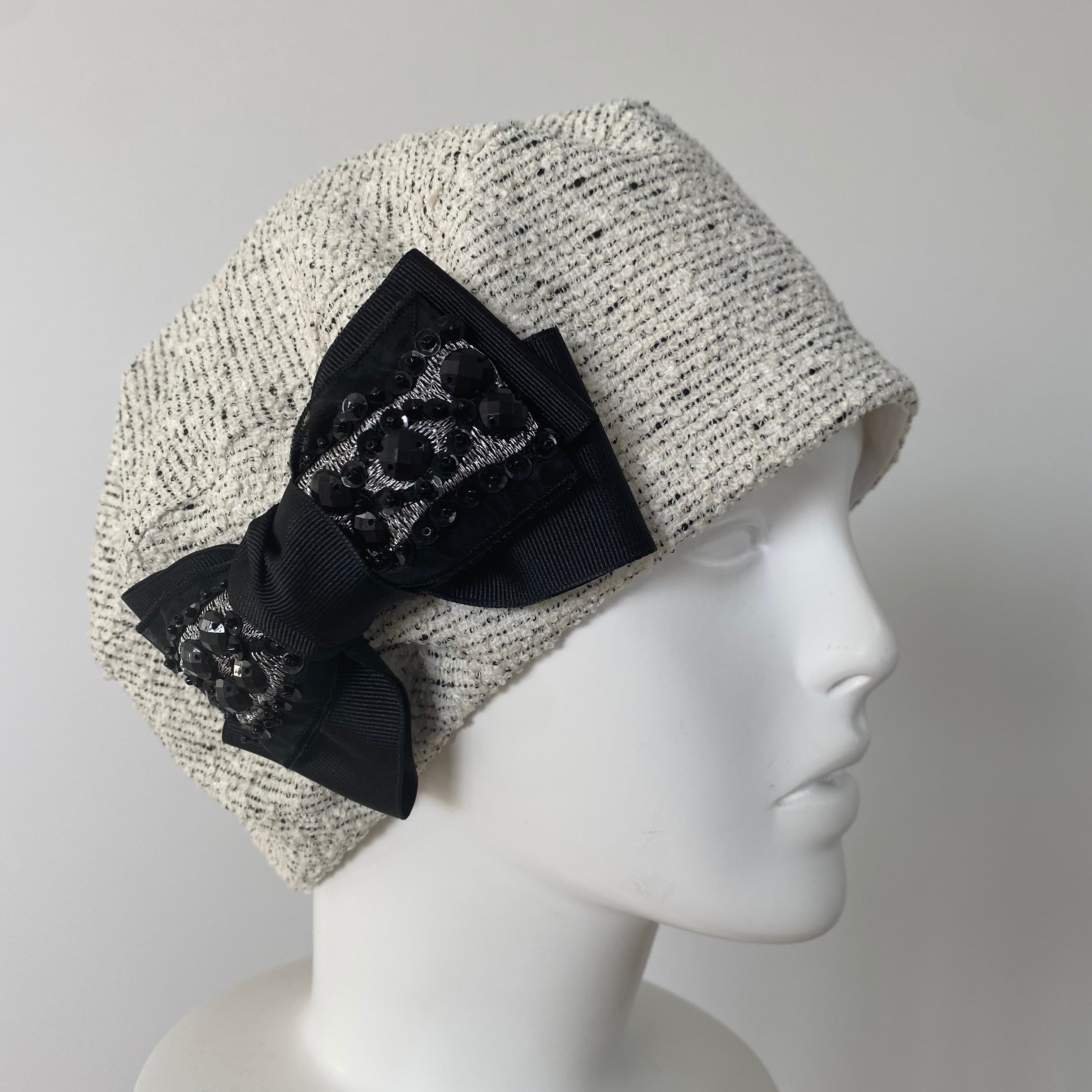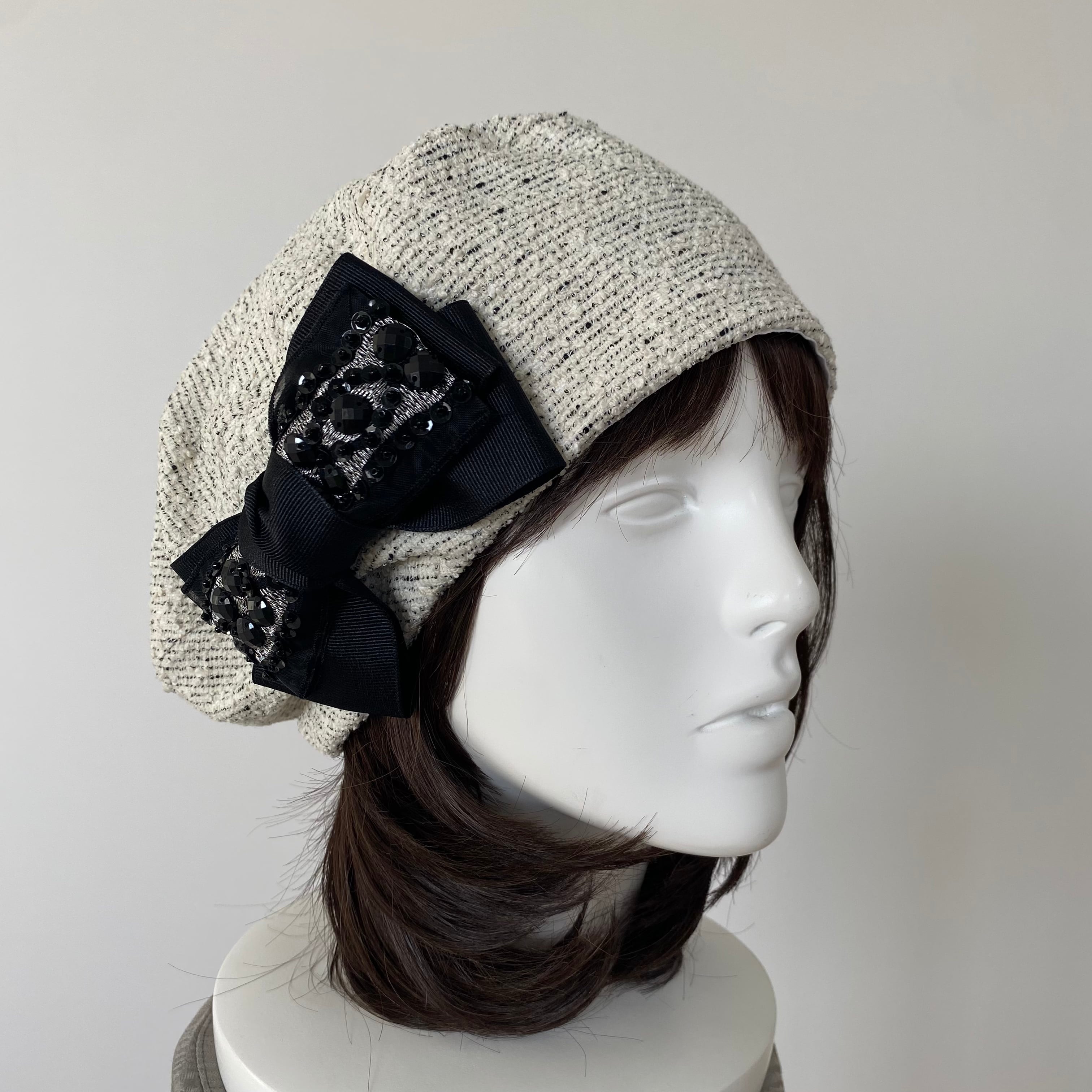 被り口にはグログランリボンを巻いており後ろに少しゴムが入っております。