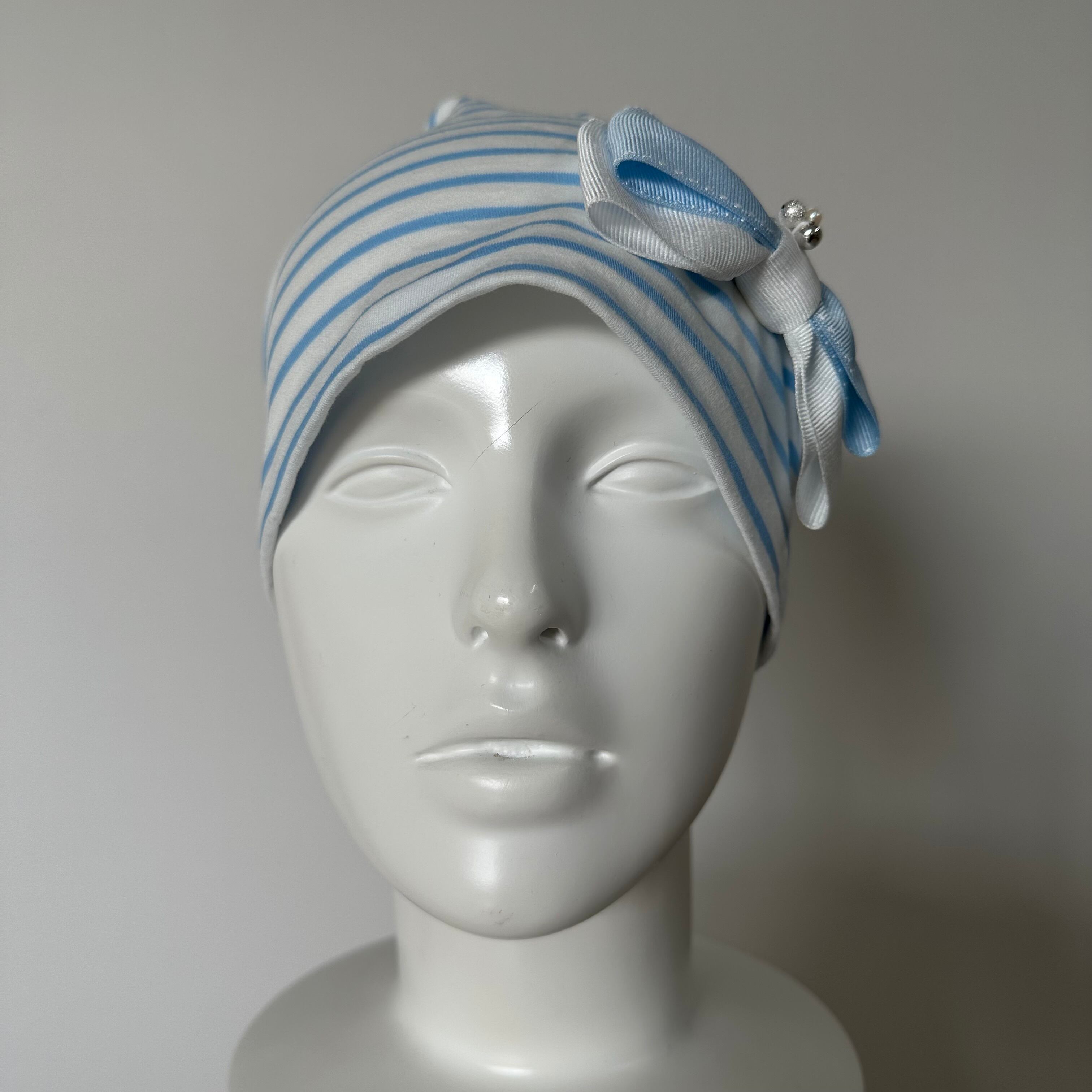 シルバーモチーフとパールのケア帽子 水色×白ボーダー