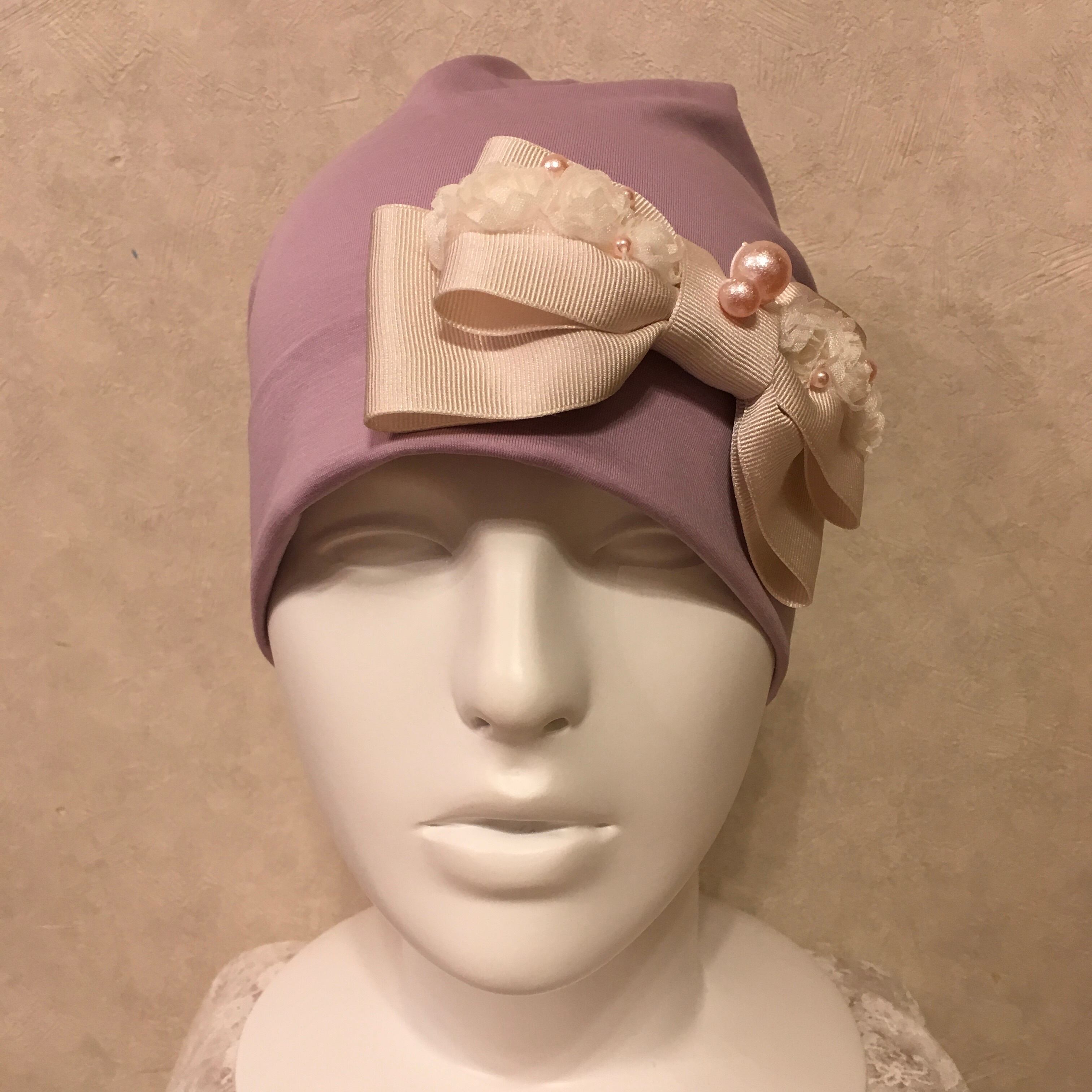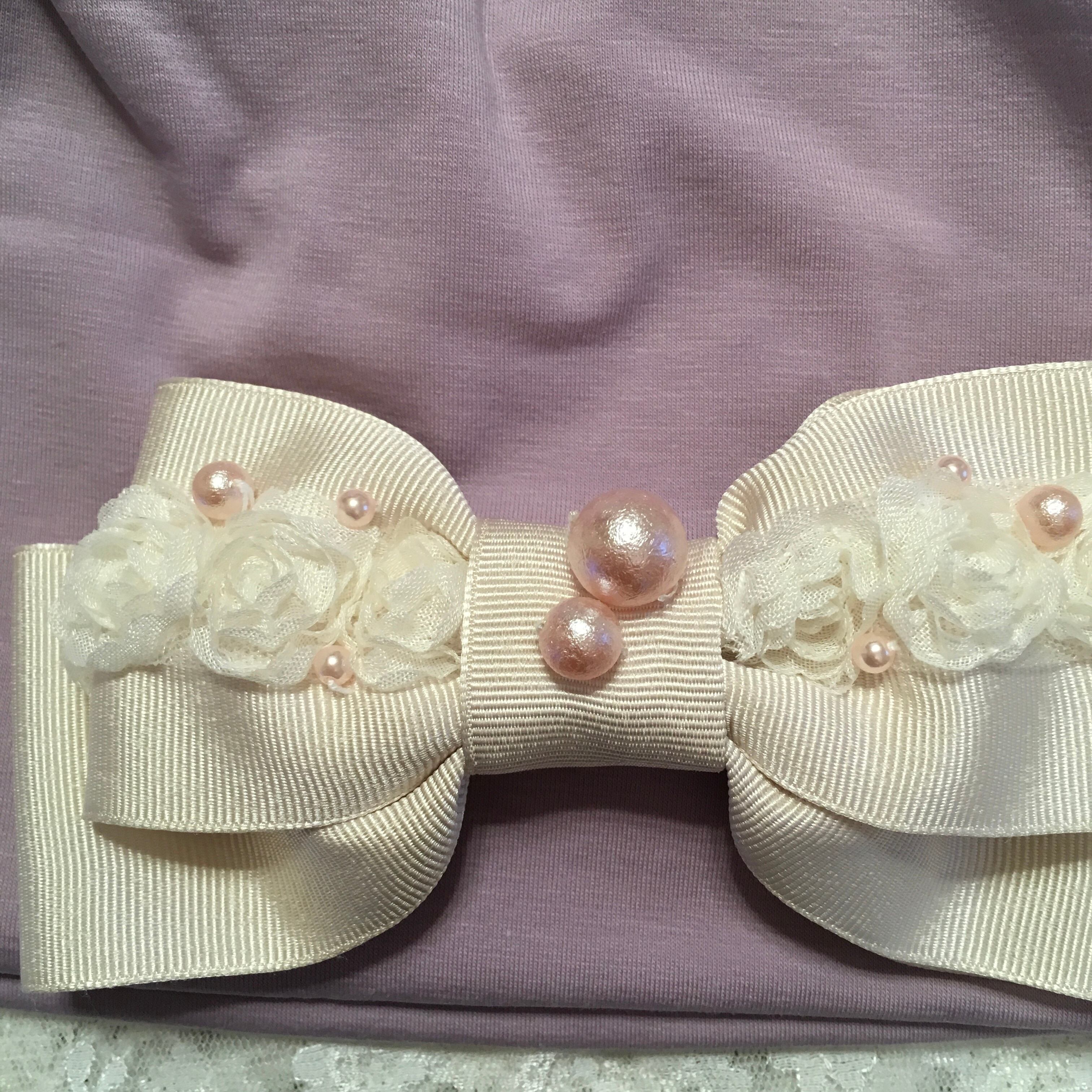 肌触りの良い伸縮性のあるお生地で作ったお帽子に薔薇のレースとパール付きグログランリボンを付けた素敵なデザインです。