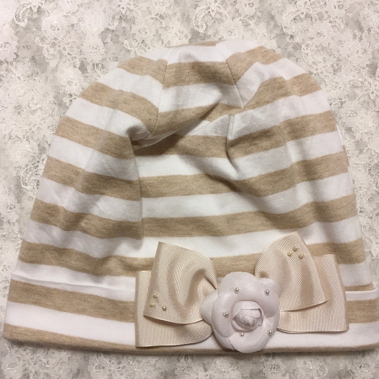 肌触りのよい伸縮性のあるお生地で作ったケア帽子にカメリアとパール付きリボンを付けた可愛いデザインです。