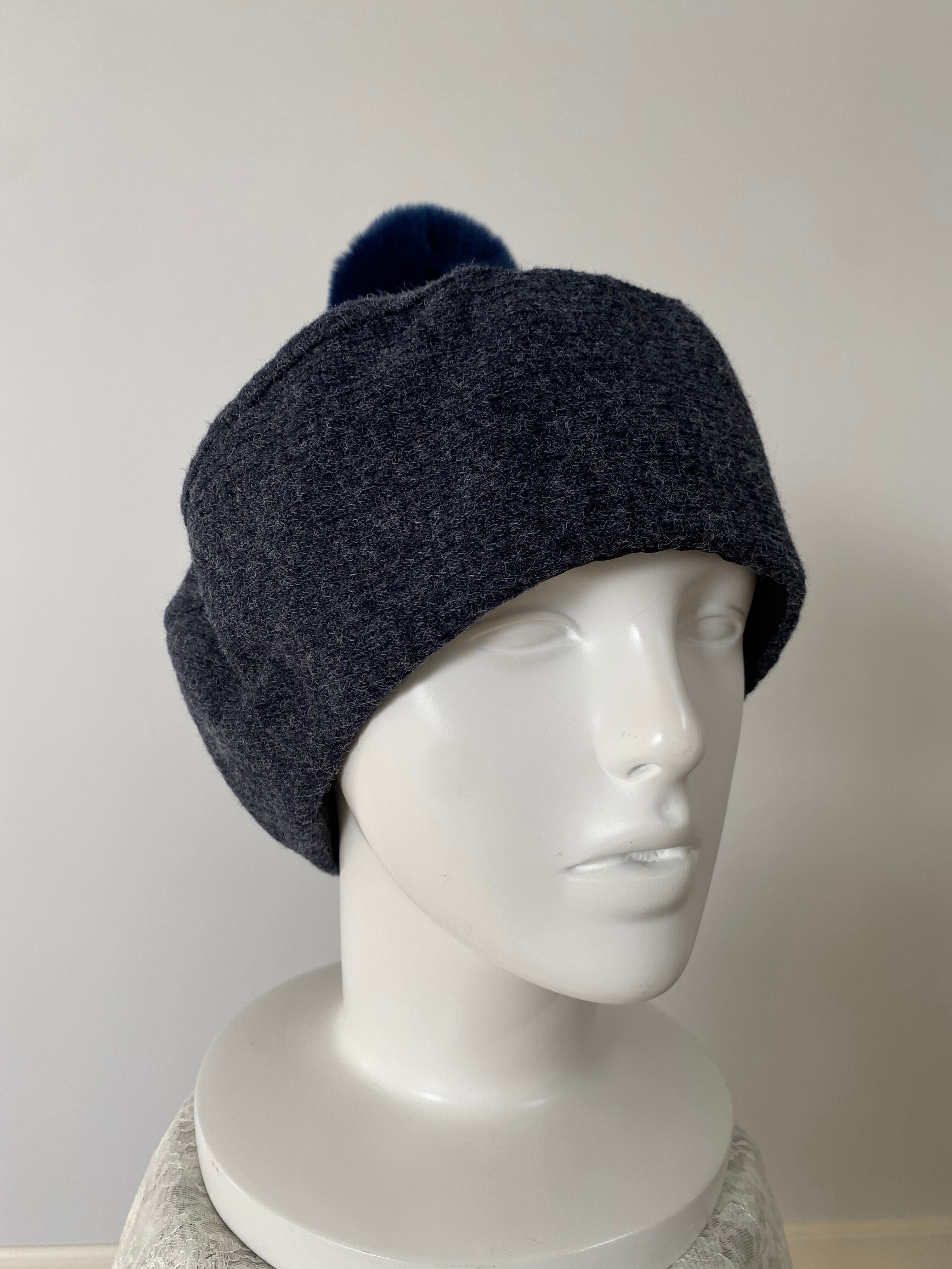 ファーポンポン付きお生地たっぷりベレー帽 リブニット