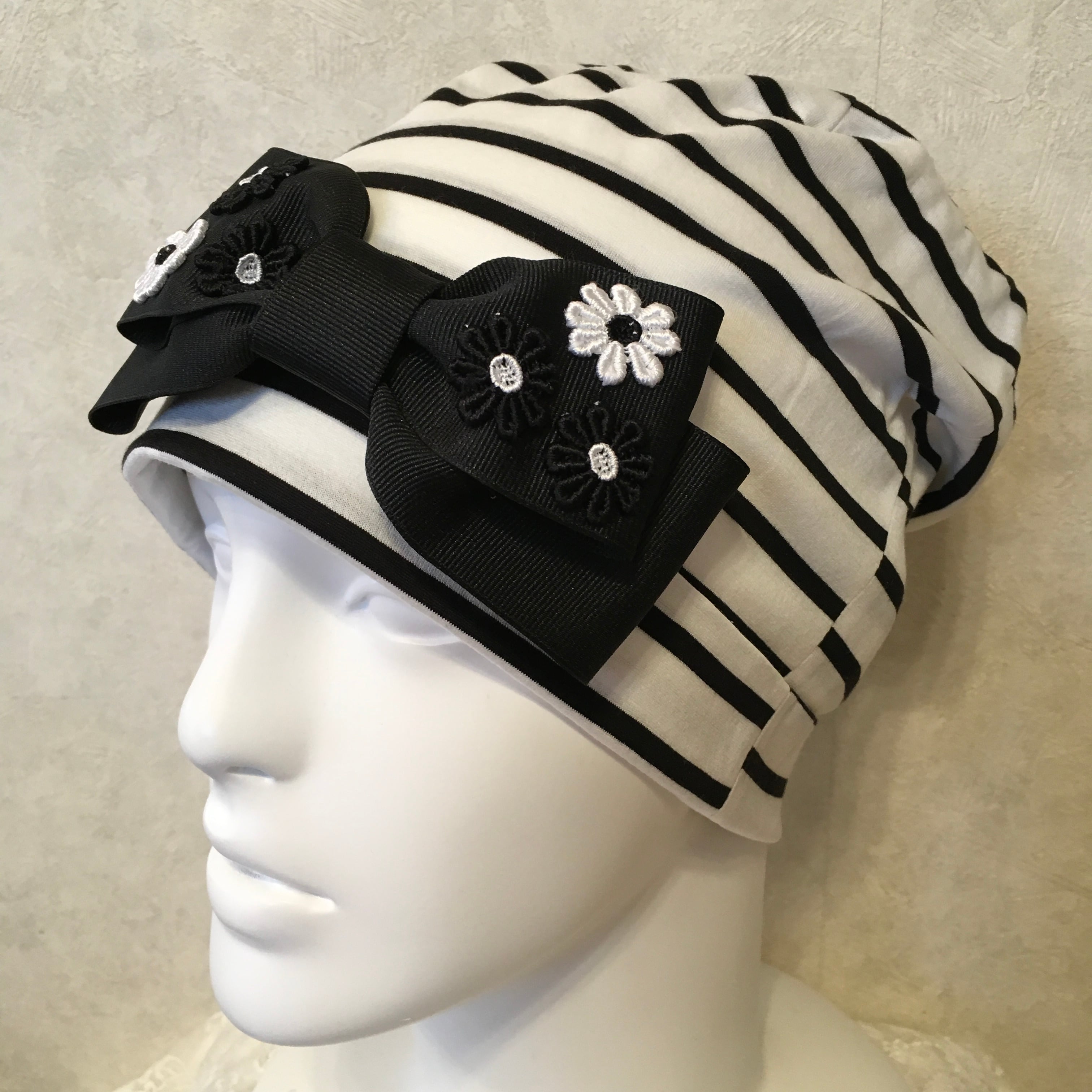 肌触りのよい伸縮性のあるお生地で作ったケア帽子にお花のモチーフ付きリボンを付けた可愛いデザインです。