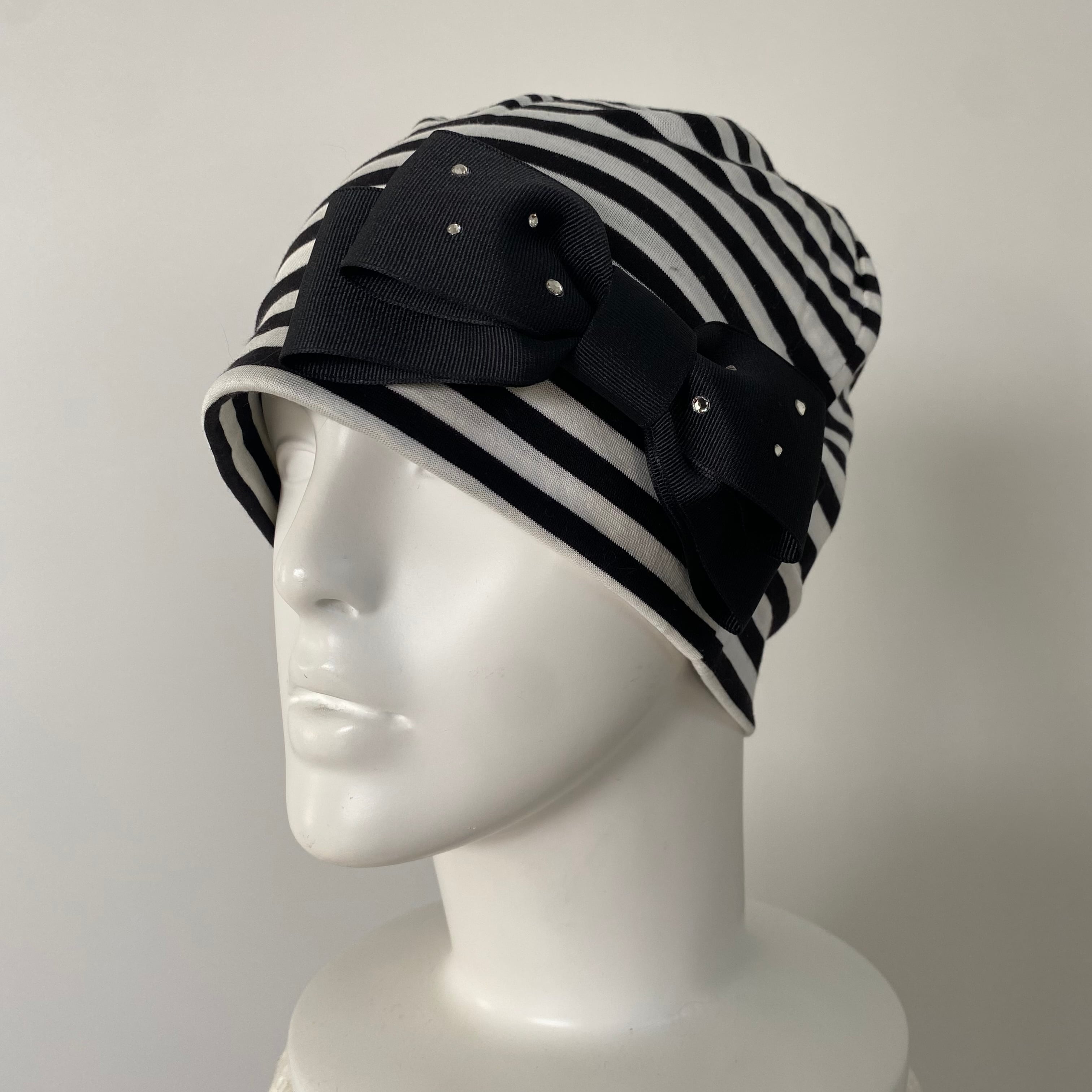 スワロフスキー付きリボンのケア帽子 白黒ボーダー