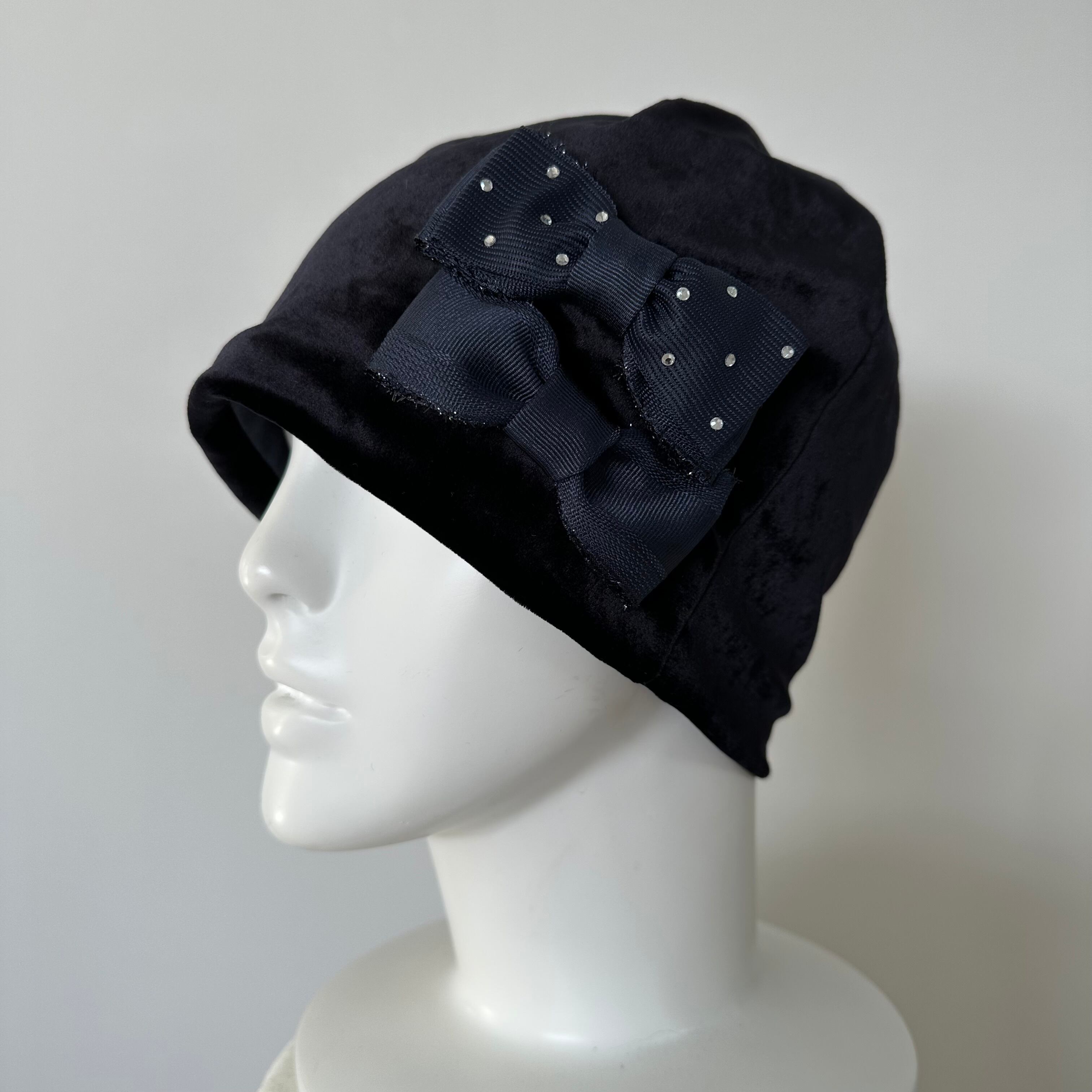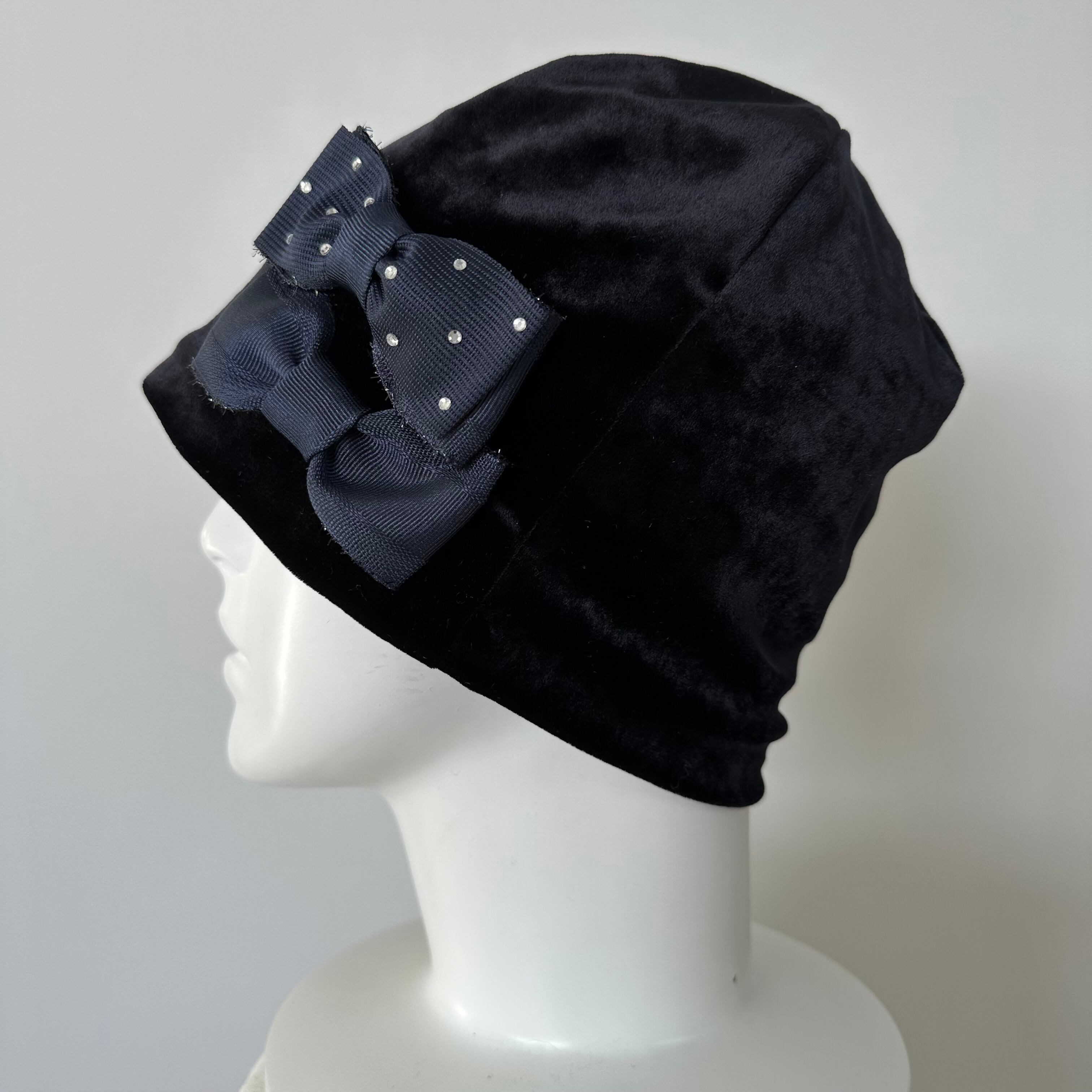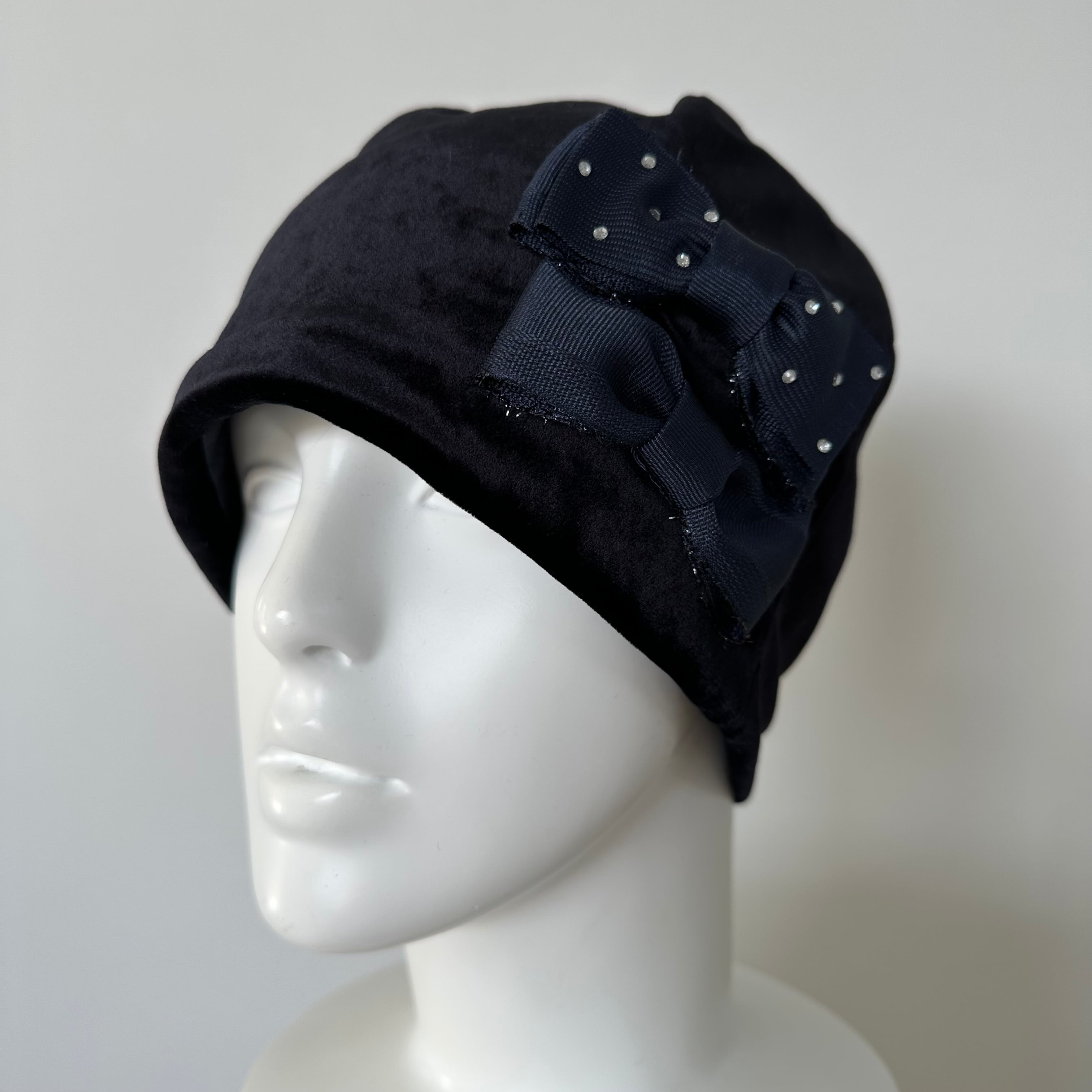 ラインストーンダブルリボンのケア帽子 ダークネイビー