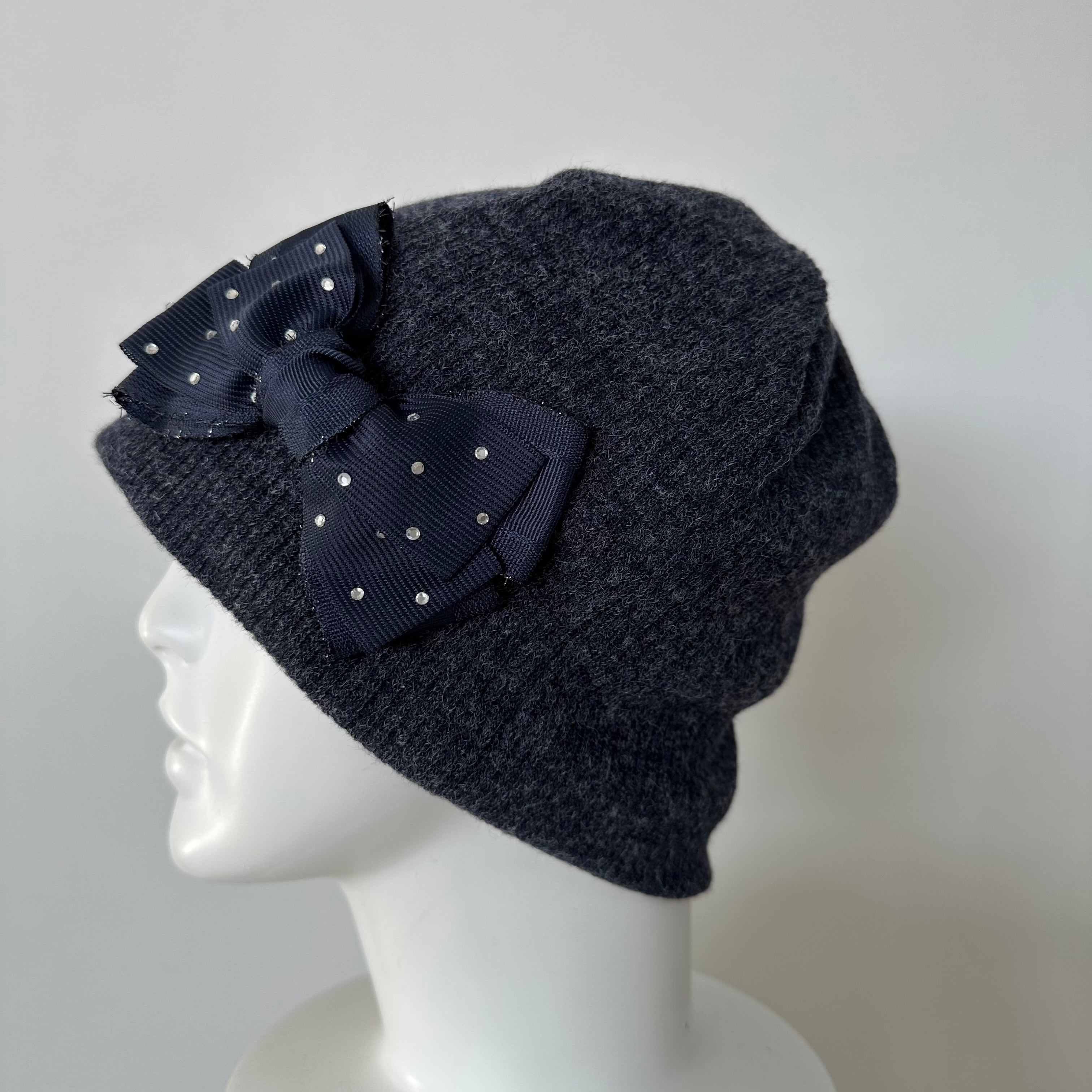 ラインストーンリボンのケア帽子 暖かウールネイビー杢系