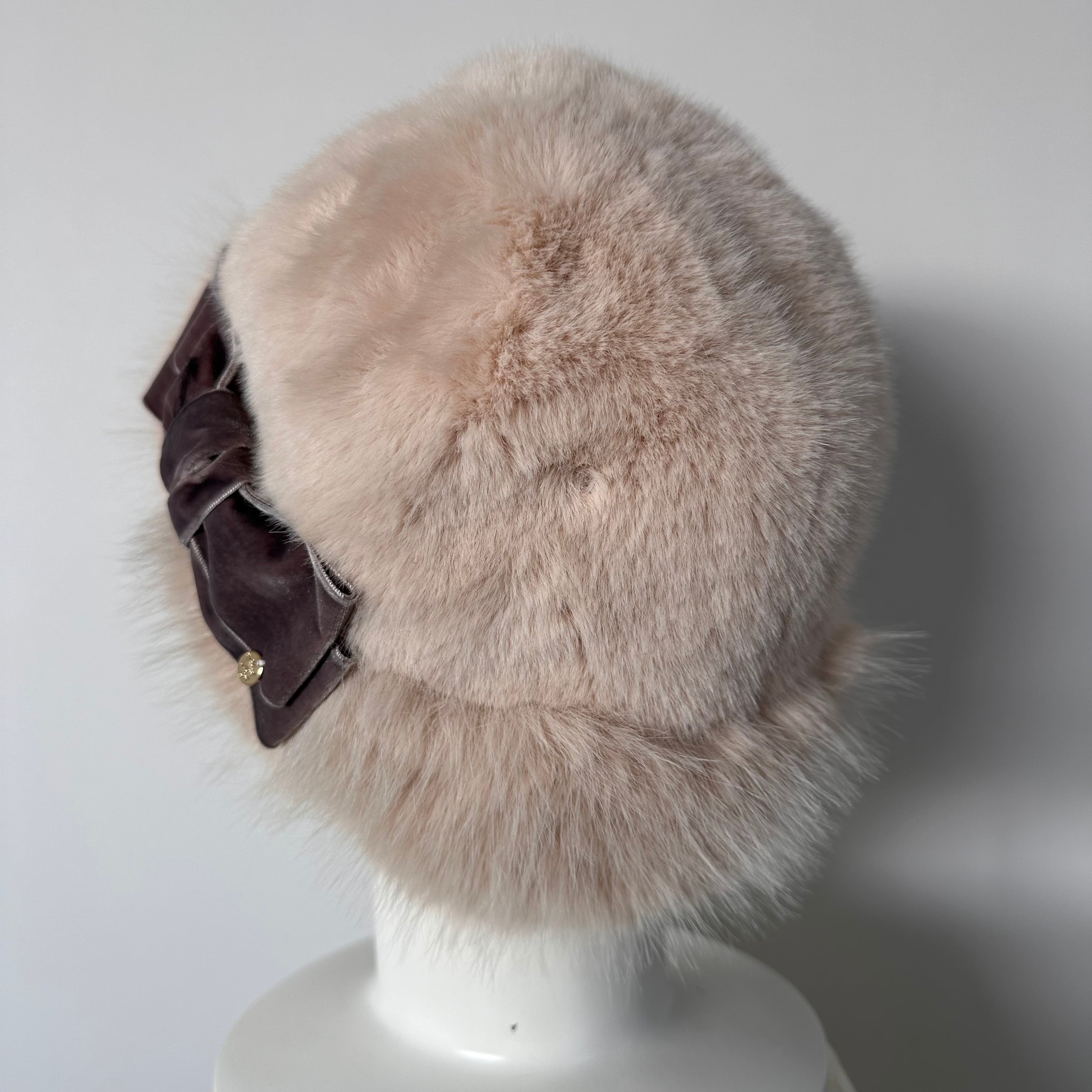 暖かくボリュームのあるエコファー生地で作ったケア帽子にベルベットリボンを付けた可愛いデザインです。