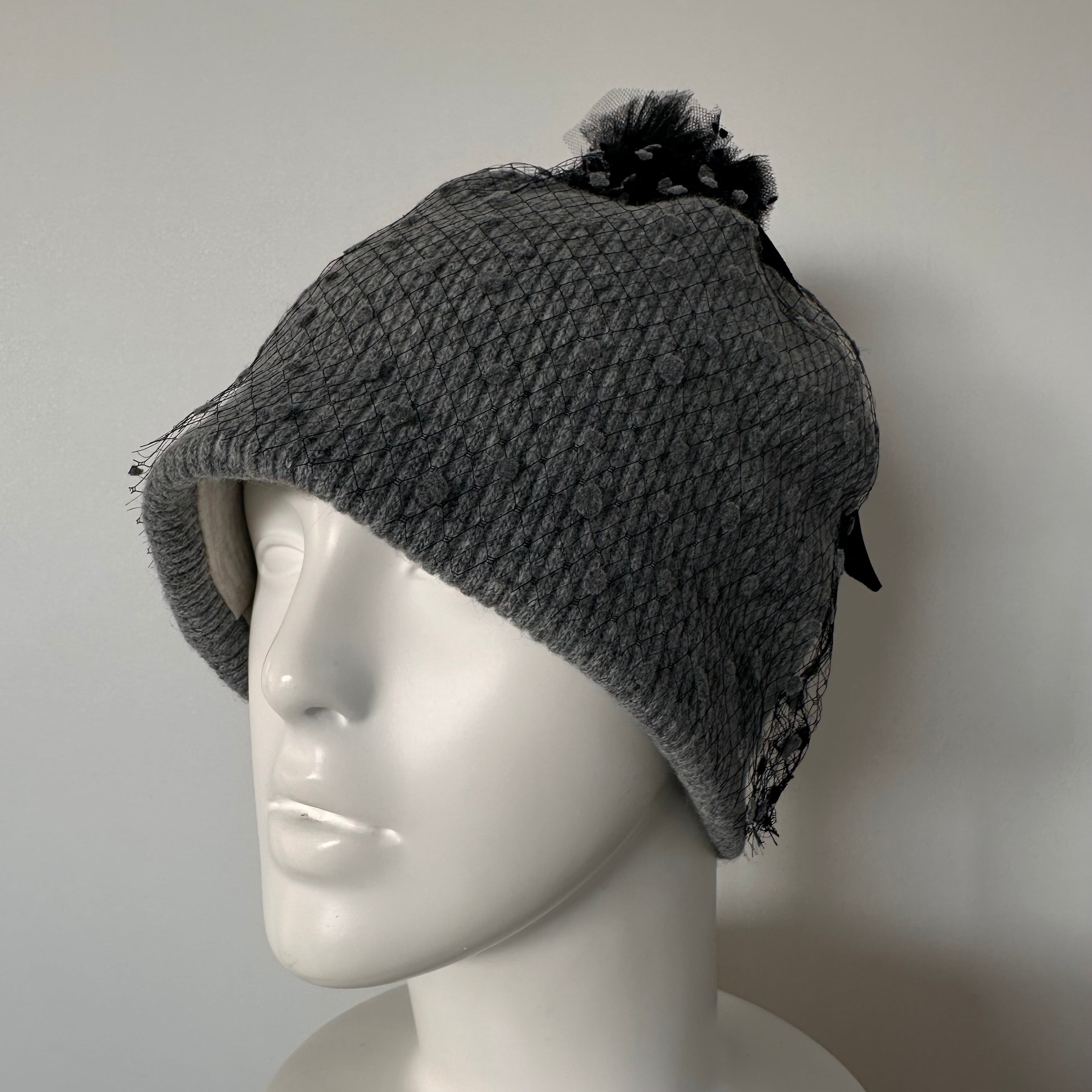 暖かいウール生地で作ったケア帽子にチュールポンポン付きのドットヘアネットを重ねた可愛いデザインです。